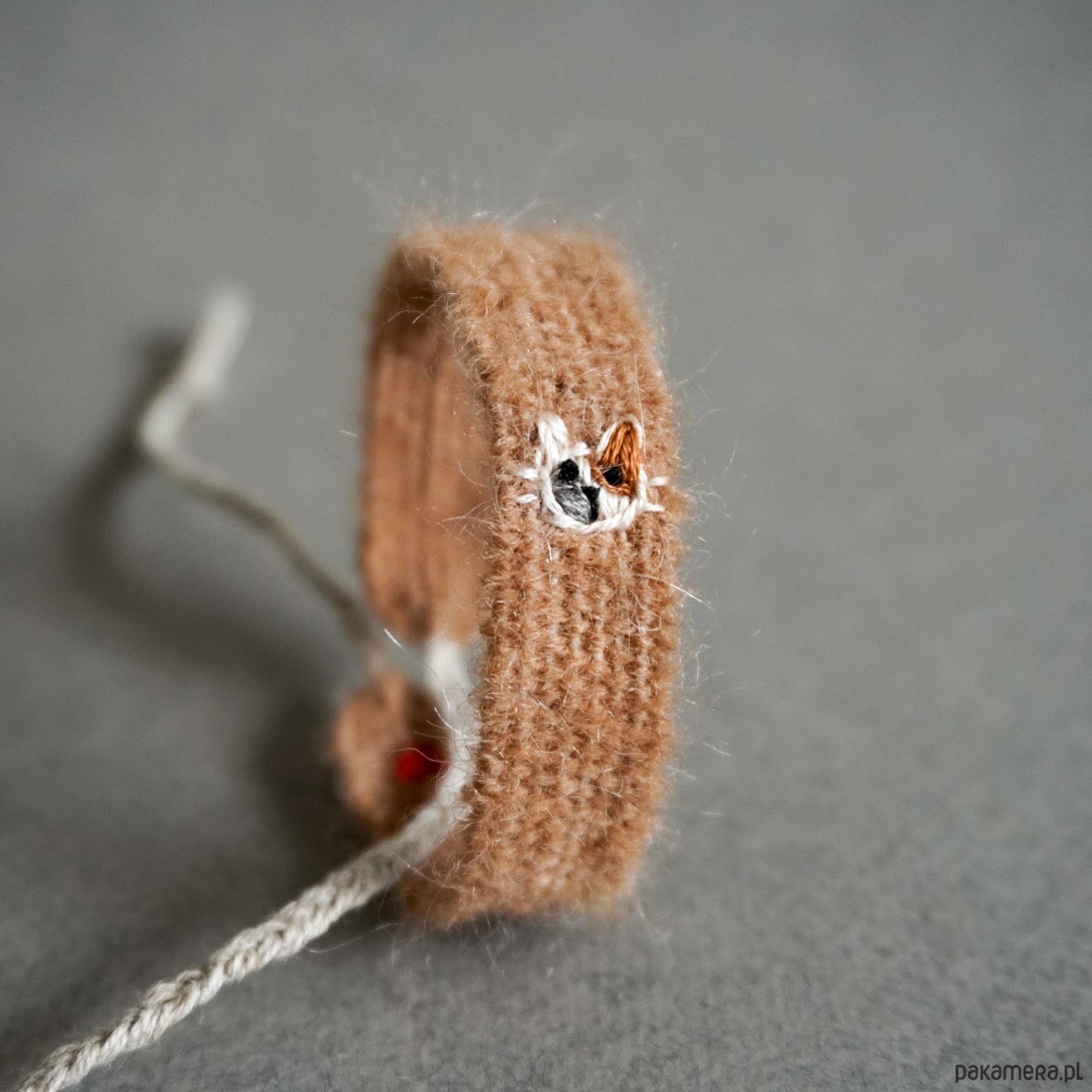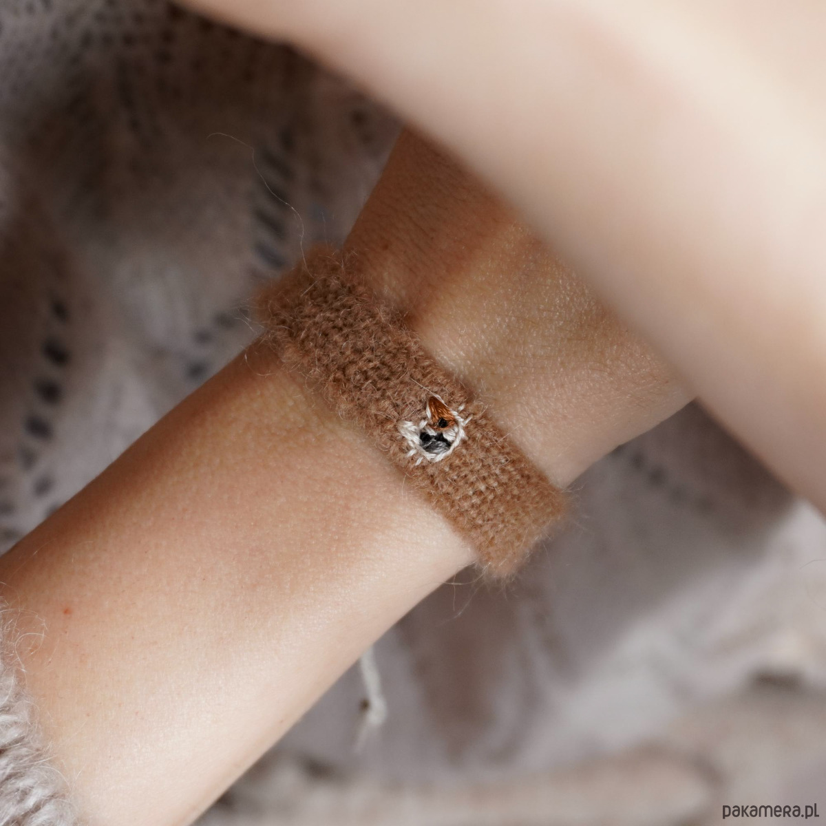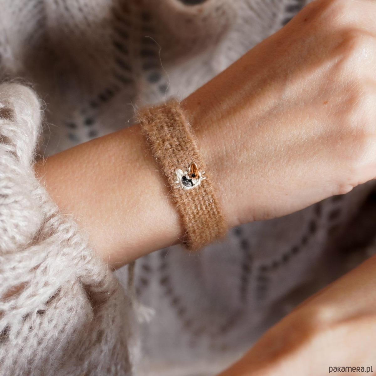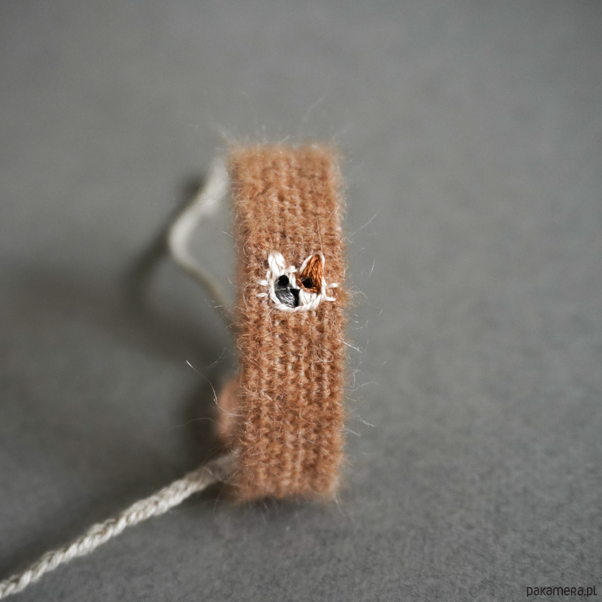 Tkana bransoletka z haftowanym kotkiem, wiązana na supełek