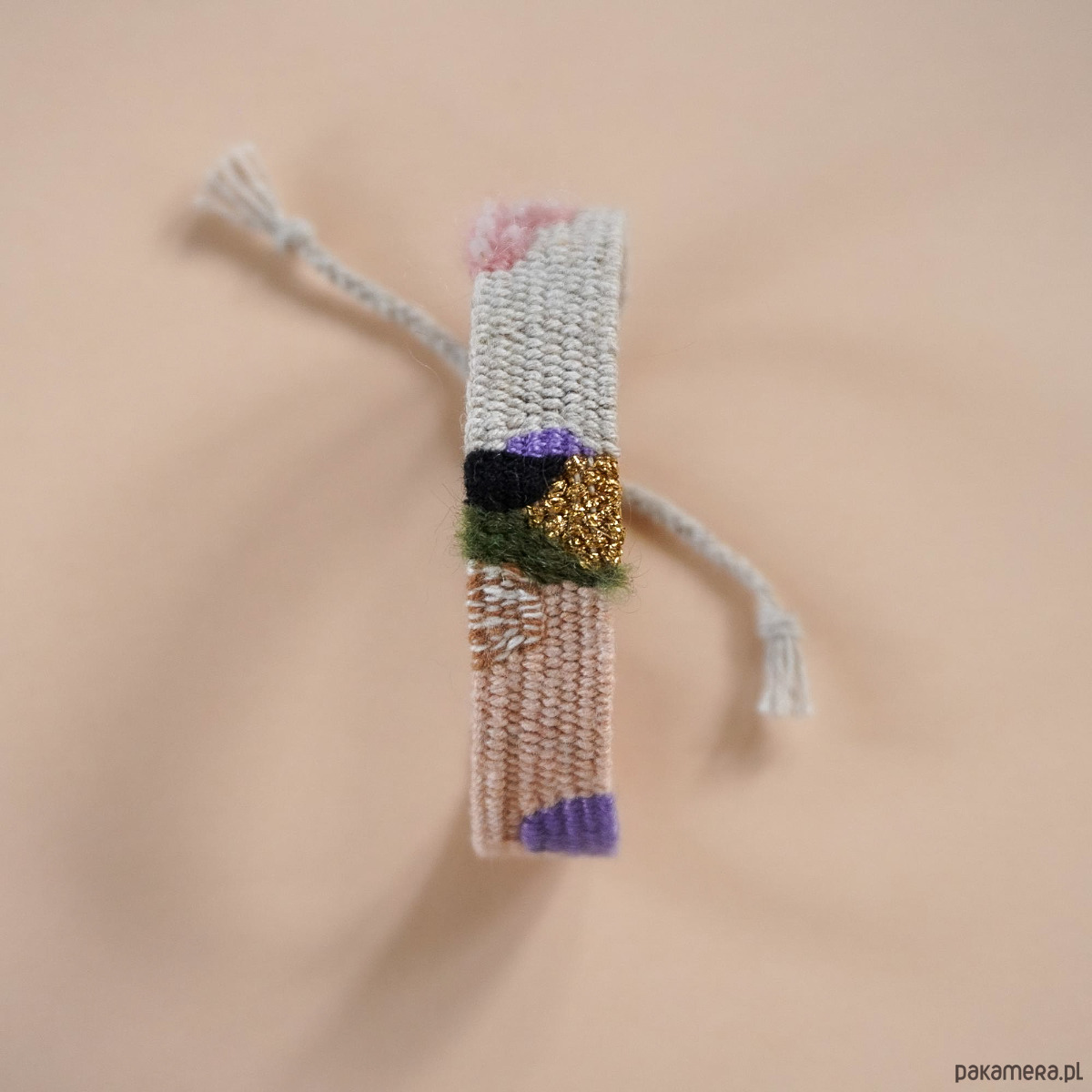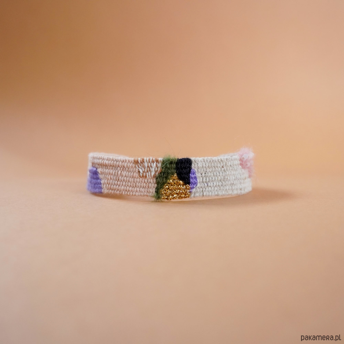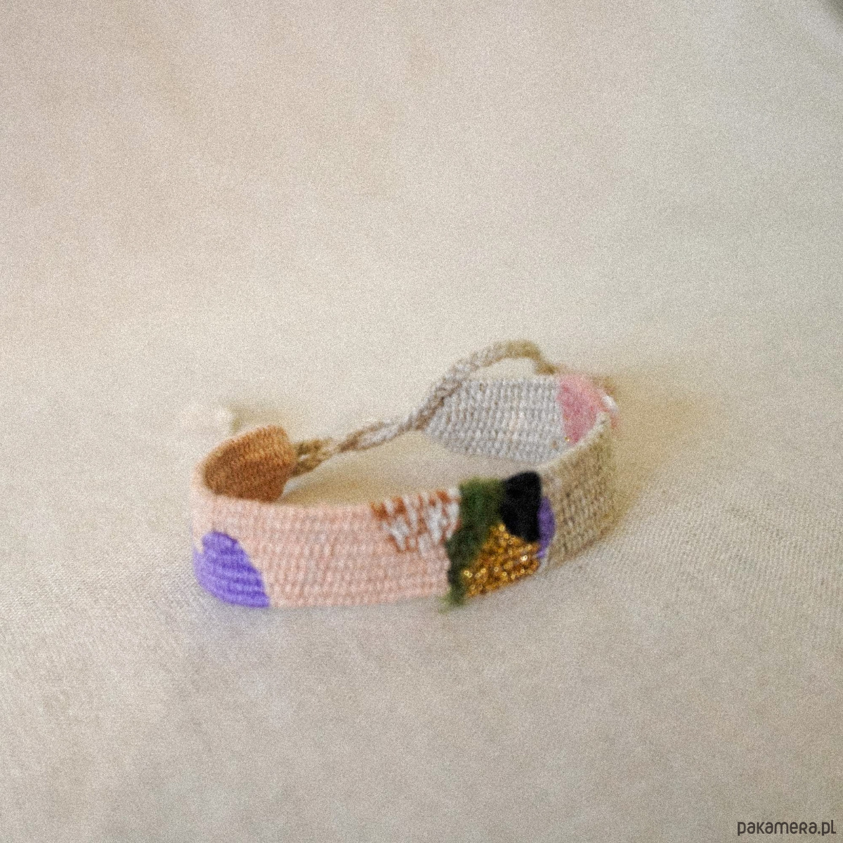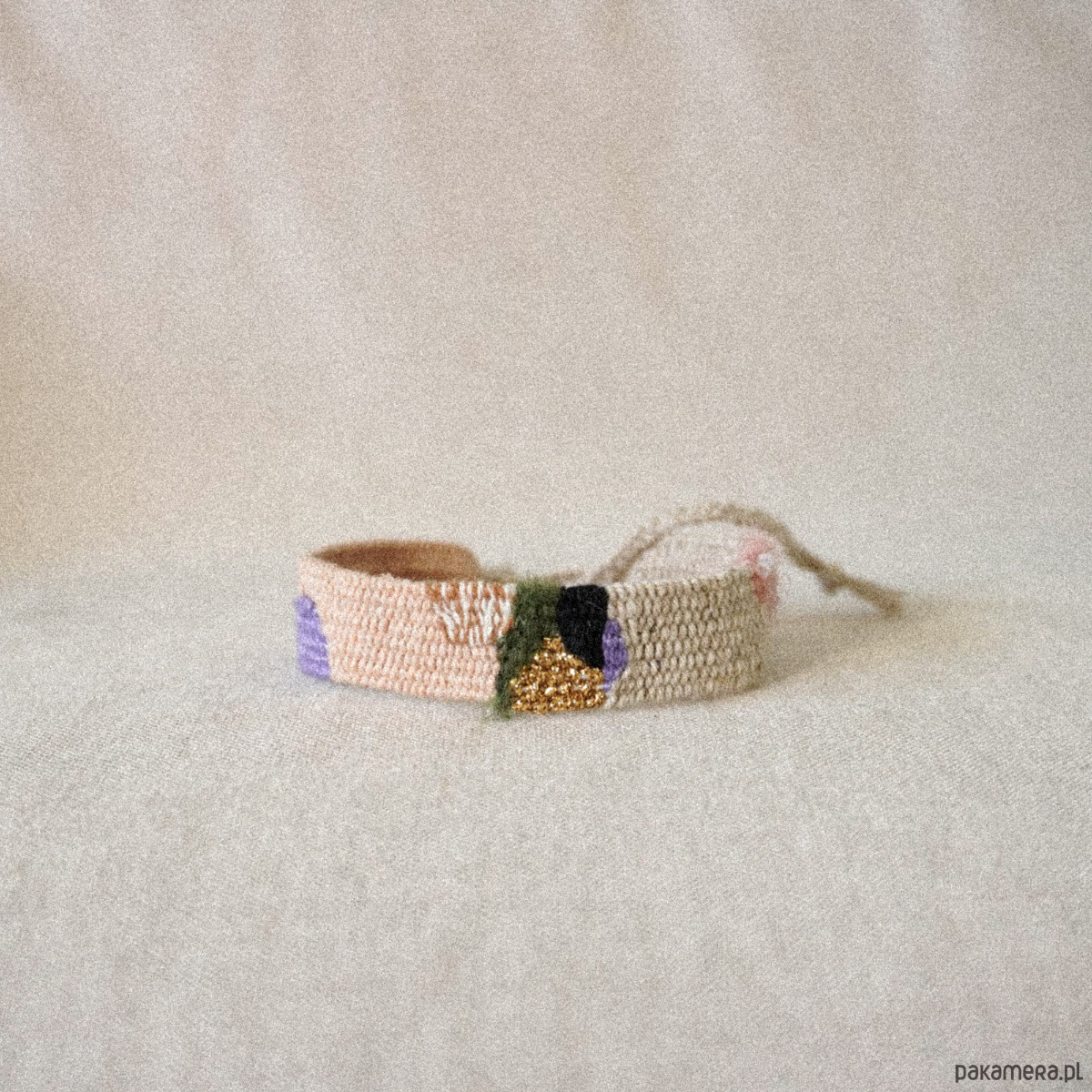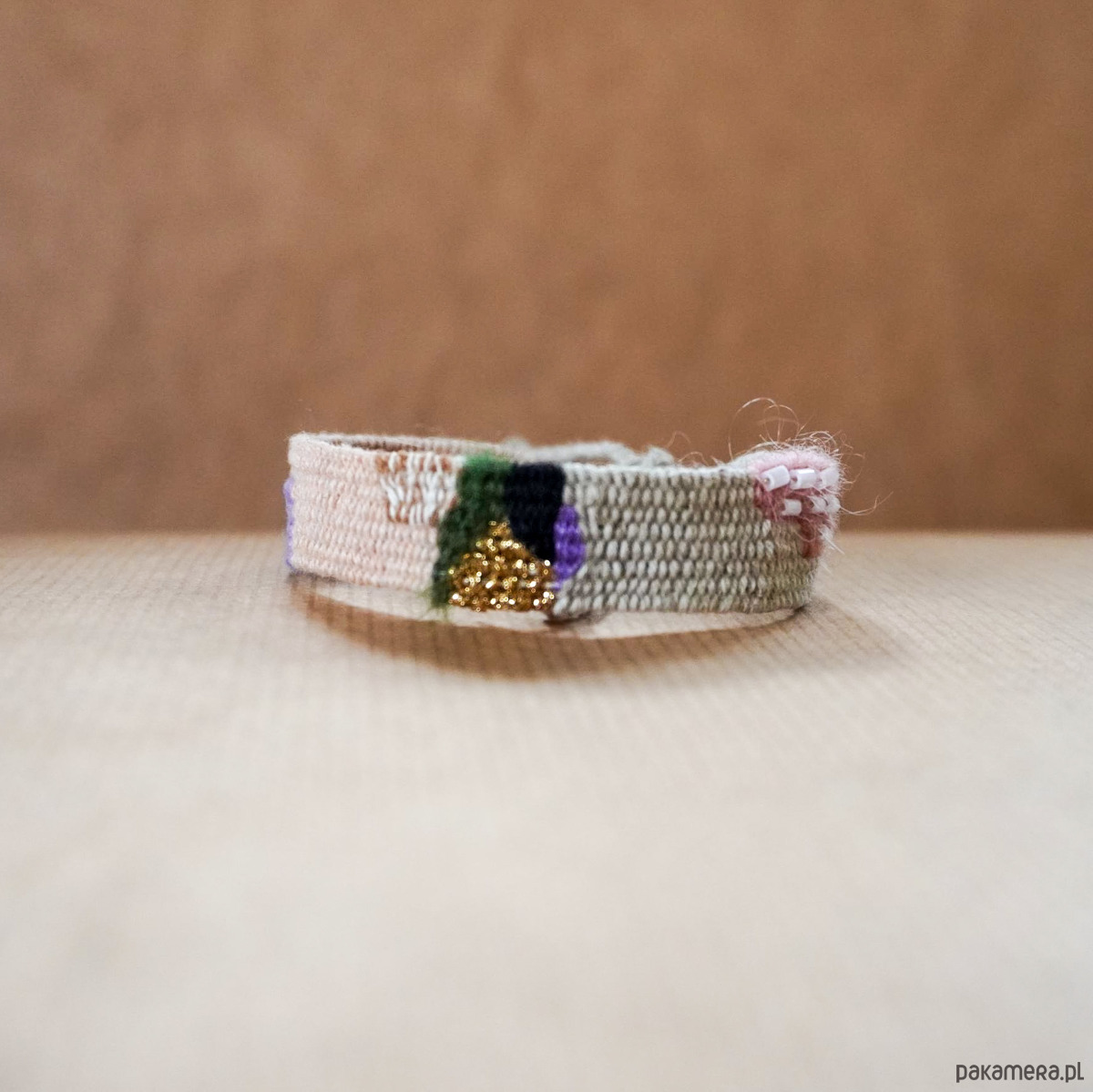 Unikatowa, ręcznie wykonana bransoletka z koralikami szklanymi. Szerokość 1,5 cm, długość części tkanej około 15 cm, dodatkowo sznureczki wiązane na supełek zapewniają regulację obwodu. Bransoletka jest niezwykle wygodna w noszeniu . Polecam serdecznie.