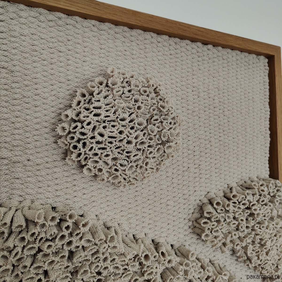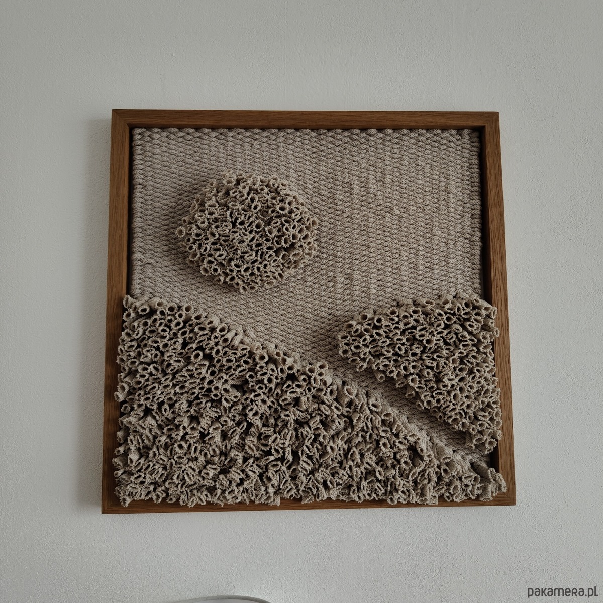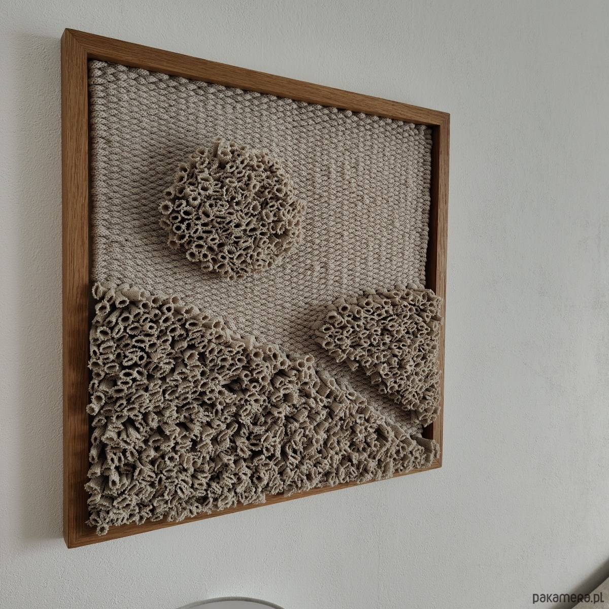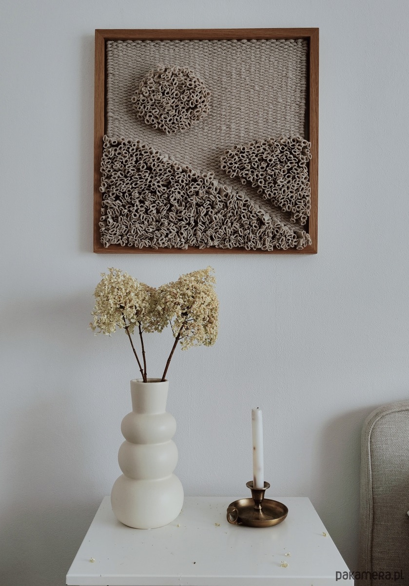 Ręcznie tkany gobelin zamknięty w ramie z litego drewna. Krajobraz z uproszczonej, symbolicznej formie. Połączenie naturalnych materiałów bawełny, włókna lnianego i drewna, w ciepłej minimalistycznej kolorystyce z bogatą teksturą daje oryginalną, przyciągającą wzrok dekorację.