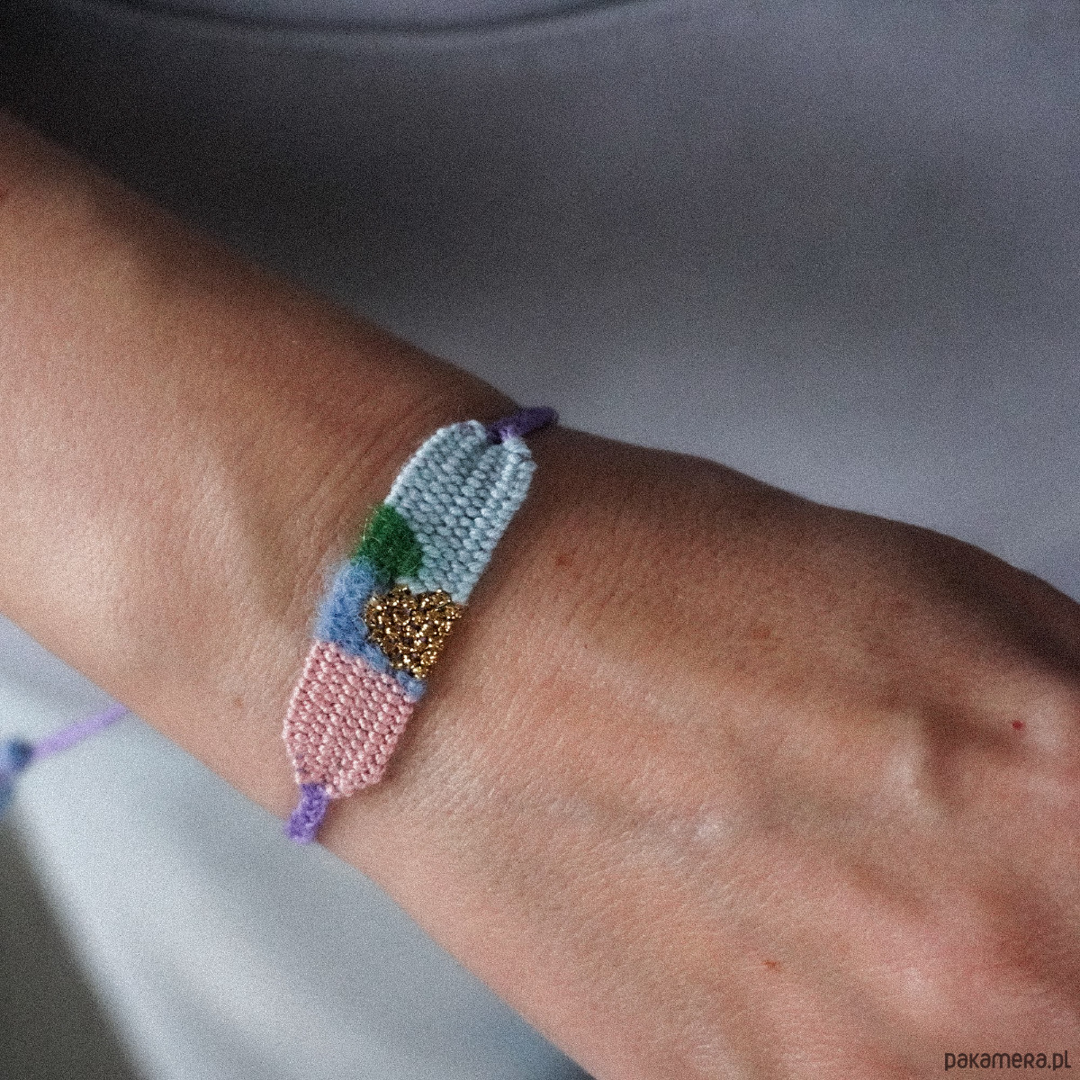 Prześliczna bransoletka tkana ręcznie w pastelowych kolorach. Część tkana ma około 4 cm długości, około 1 cm szerokości. Bransoletkę wiążemy samodzielnie, dość mocno na supełek.