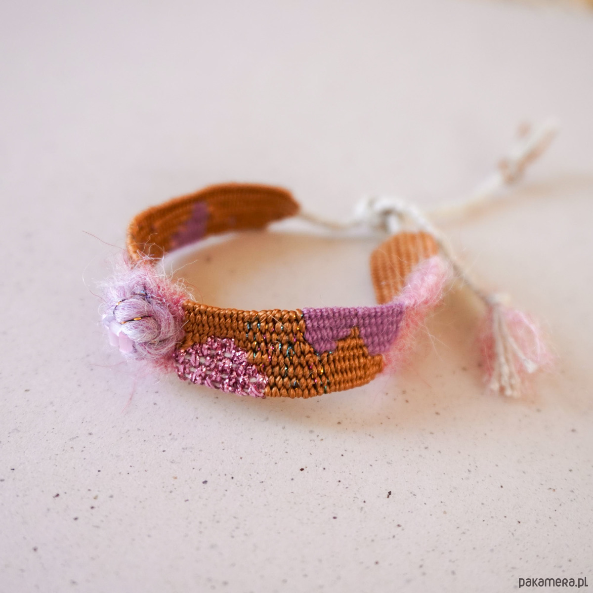 Wyjątkowa bransoletka tkana z kwiatuszkiem z koralikami. Nasycone kolory, niezwykłe połączenie faktur nici i technik wykonania tworzą niesamowity efekt. Szerokość części tkanej to niecałe 1,5 cm, długość części tkanej to około 14, 15 cm. Bransoletkę wiąże się samodzielnie na supełek. Polecam gorąco♡. Bransoletki są estetycznie zapakowane, więc idealnie nadają się na prezent.