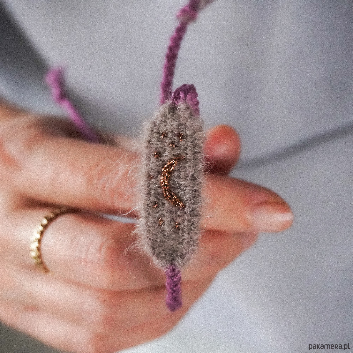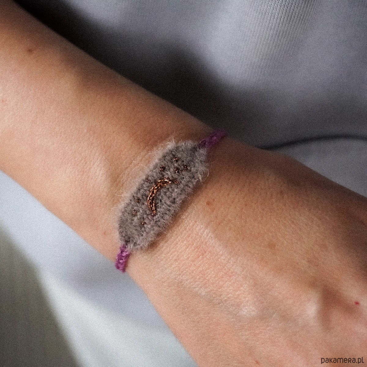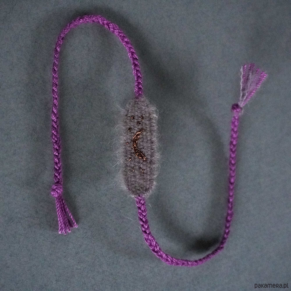 Mini bransoletka, wykonana w całości ręcznie z haftowanym księżycem i gwiazdkami 😉. Część tkana ma około 4 cm długości, około 1 cm szerokości. Bransoletkę wiążemy samodzielnie, dość mocno na supełek.