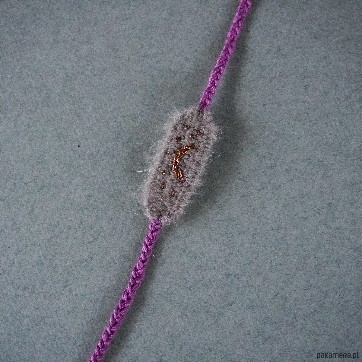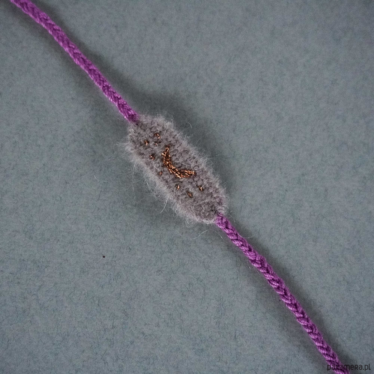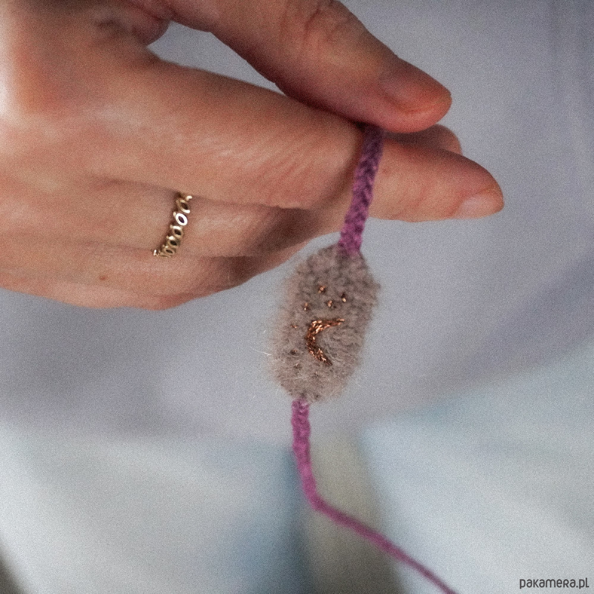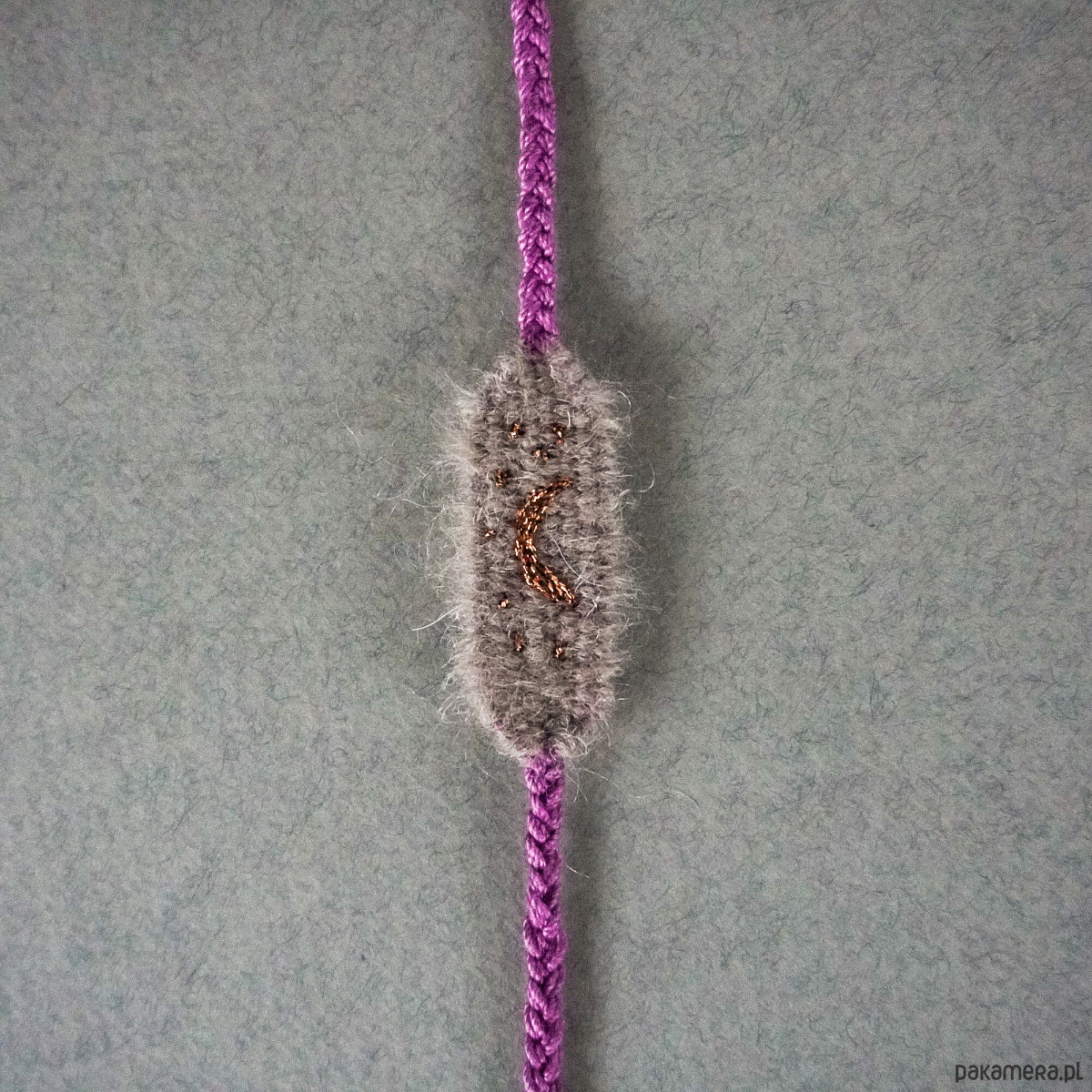 Mini bransoletka, wykonana w całości ręcznie z haftowanym księżycem i gwiazdkami 😉. Część tkana ma około 4 cm długości, około 1 cm szerokości. Bransoletkę wiążemy samodzielnie, dość mocno na supełek.