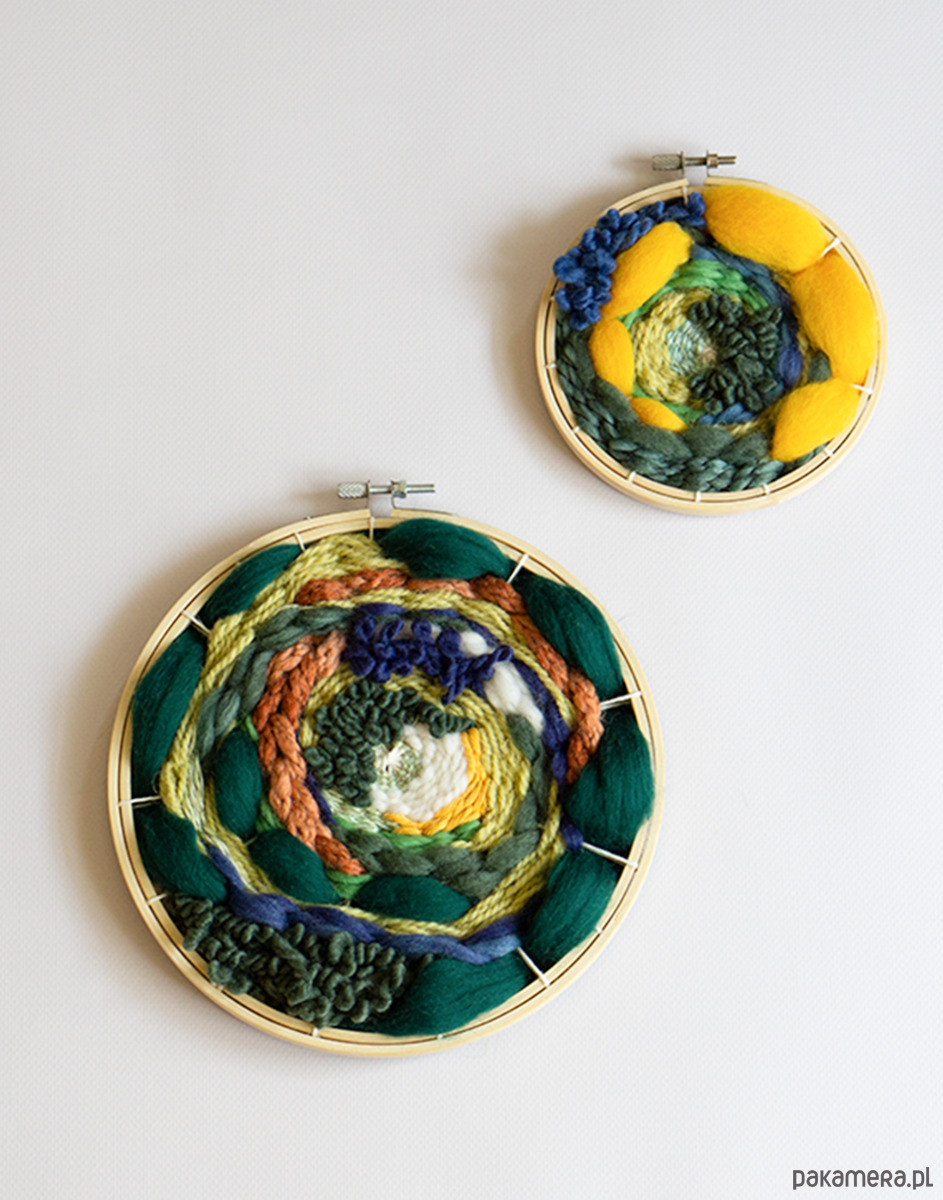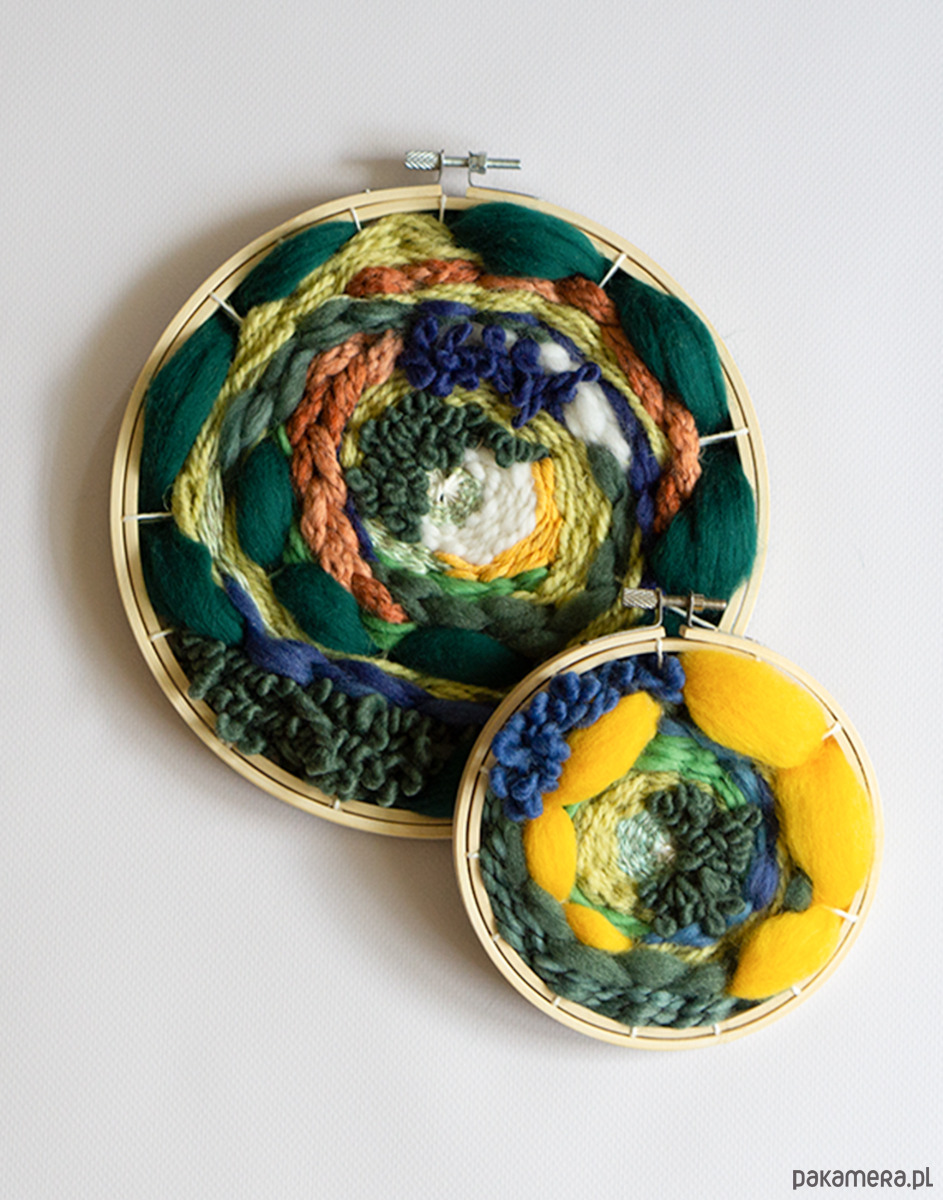 ✨ To, co czyni je unikatowymi, to ich forma. Obie tkaniny zostały wykonane na tamborkach, co nadaje im okrągły, spiralny charakter. Proces tworzenia takich tkanin różni się od tradycyjnych prostokątnych czy kwadratowych form, a efekt jest niepowtarzalny. Drewniane tamborki pełnią funkcję zarówno ramy, jak i uchwytu, wystarczy je zawiesić na ścianie, bez dodatkowych elementów.✨