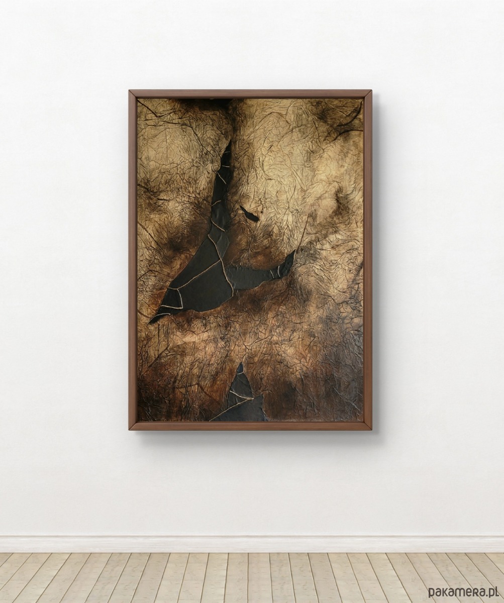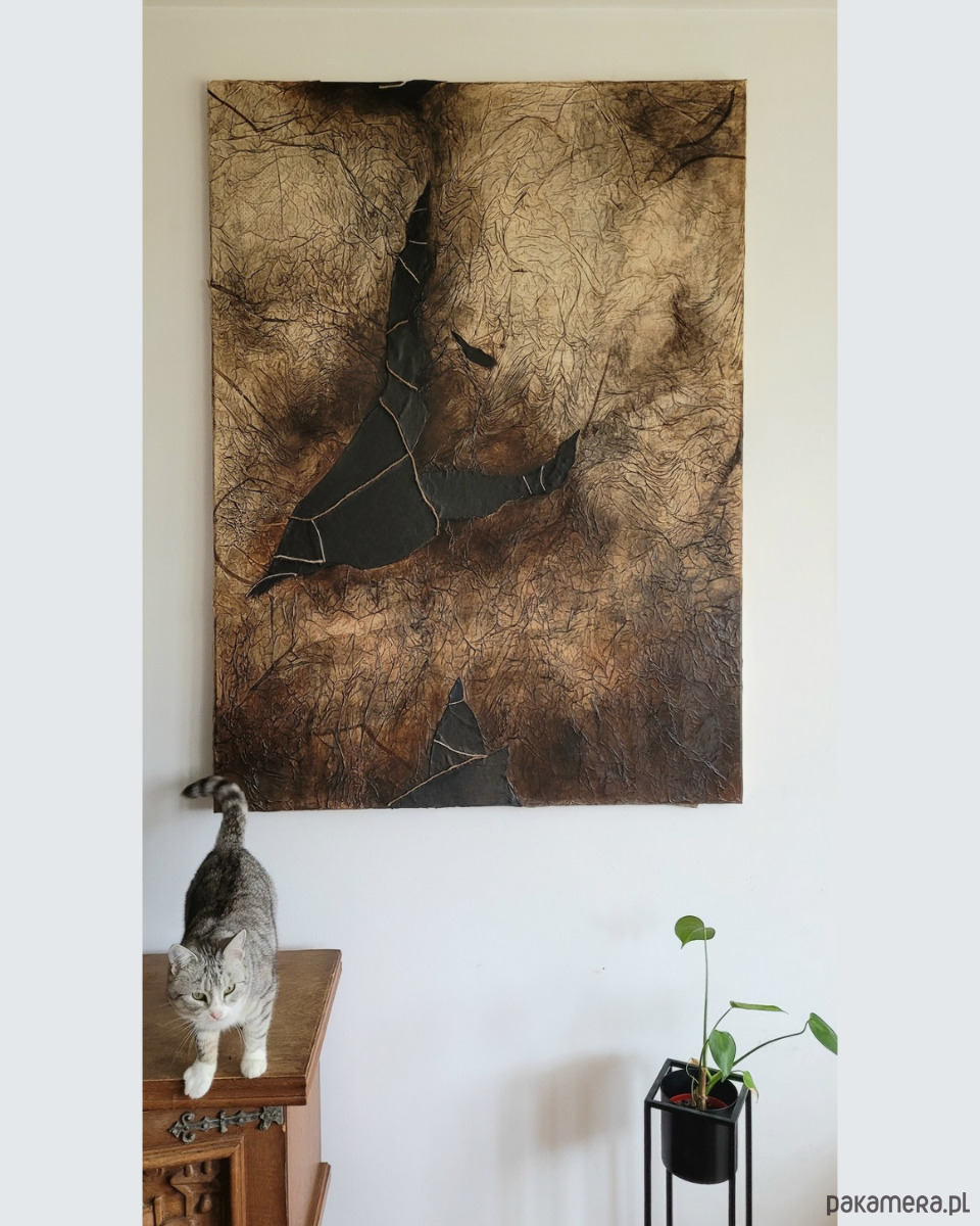 Na sprzedaż oferuję dużych rozmiarów obraz abstrakcyjny o mocno wyczuwalnej strukturze i charakterystycznej, warstwowej kompozycji. Zastosowanie papieru, skóry, sznurka oraz farb akrylowych nadaje pracy unikatową formę oraz głębię, dzięki czemu świetnie sprawdzi się jako centralny punkt nowoczesnego wnętrza.