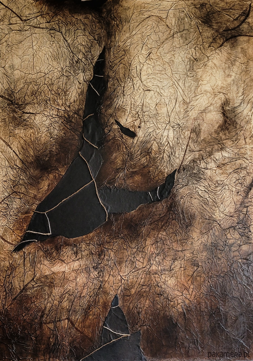 Technika: mix media – papier, skóra, sznurek, farba akrylowa