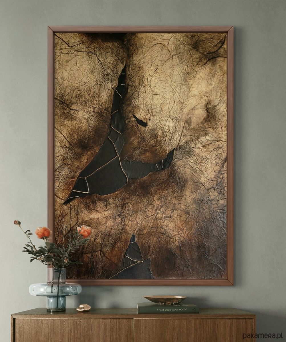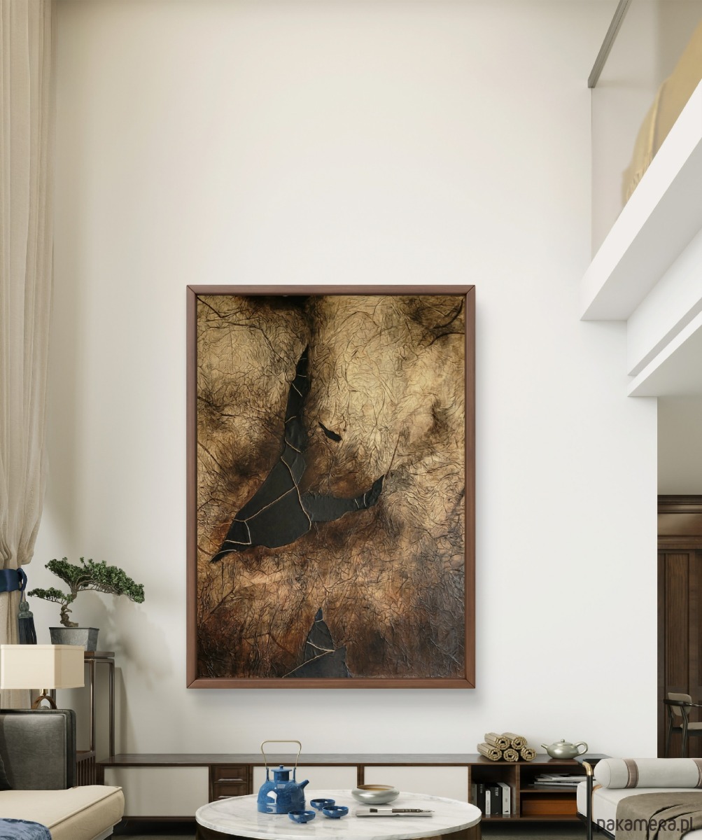 Na sprzedaż oferuję dużych rozmiarów obraz abstrakcyjny o mocno wyczuwalnej strukturze i charakterystycznej, warstwowej kompozycji. Zastosowanie papieru, skóry, sznurka oraz farb akrylowych nadaje pracy unikatową formę oraz głębię, dzięki czemu świetnie sprawdzi się jako centralny punkt nowoczesnego wnętrza.