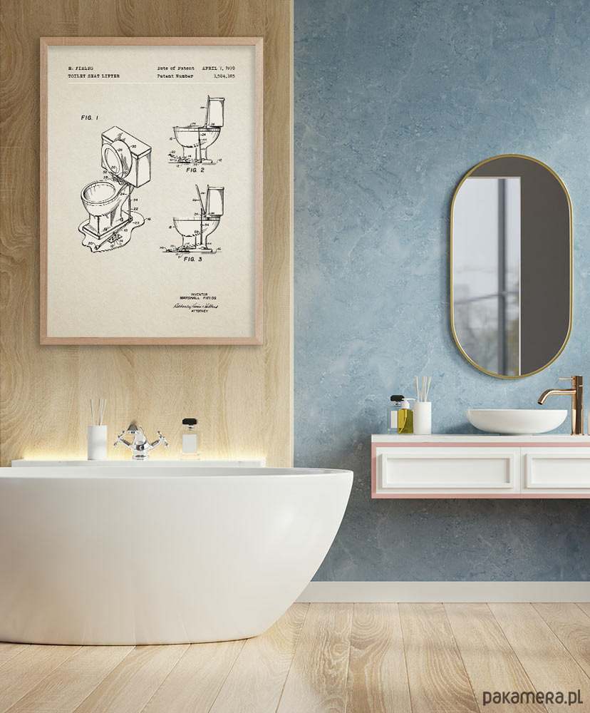 Plakat z reprodukcją patentu na podnośnik deski toaletowej wynaleziony przez Marshalla Fieldsa w 1970 roku, to idealna dekoracja Twojej łazienki. Proste pomysły sprawdzają się najlepiej - nie ma nic bardziej oczywistego niż ozdobienie łazienki grafikami nawiązującymi do jej wyposażenia.
