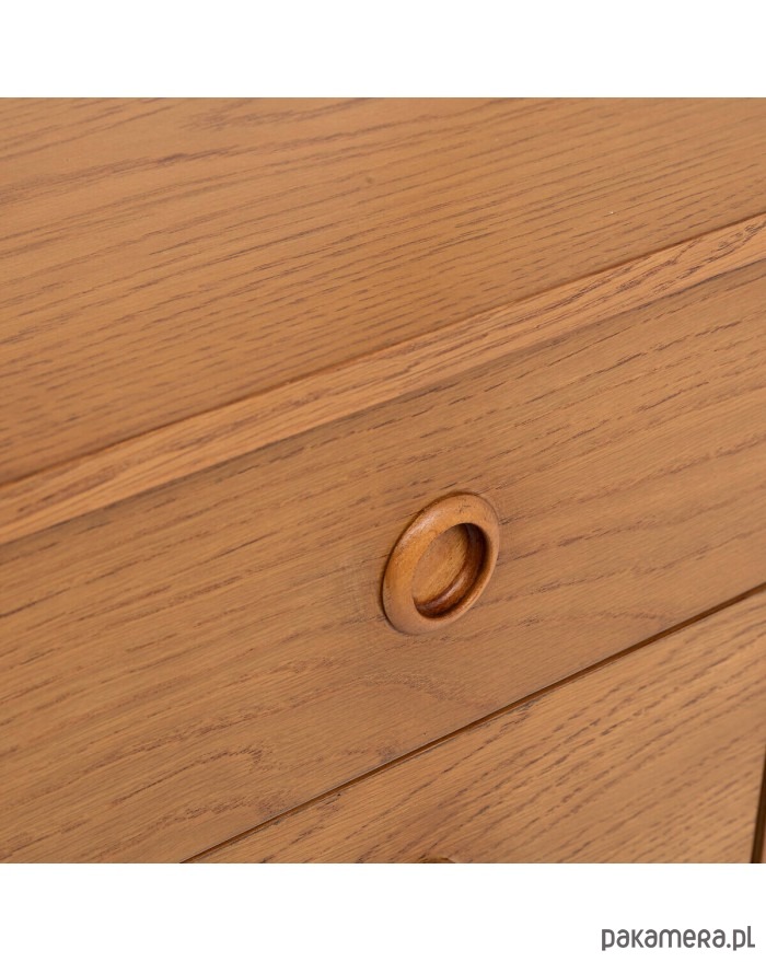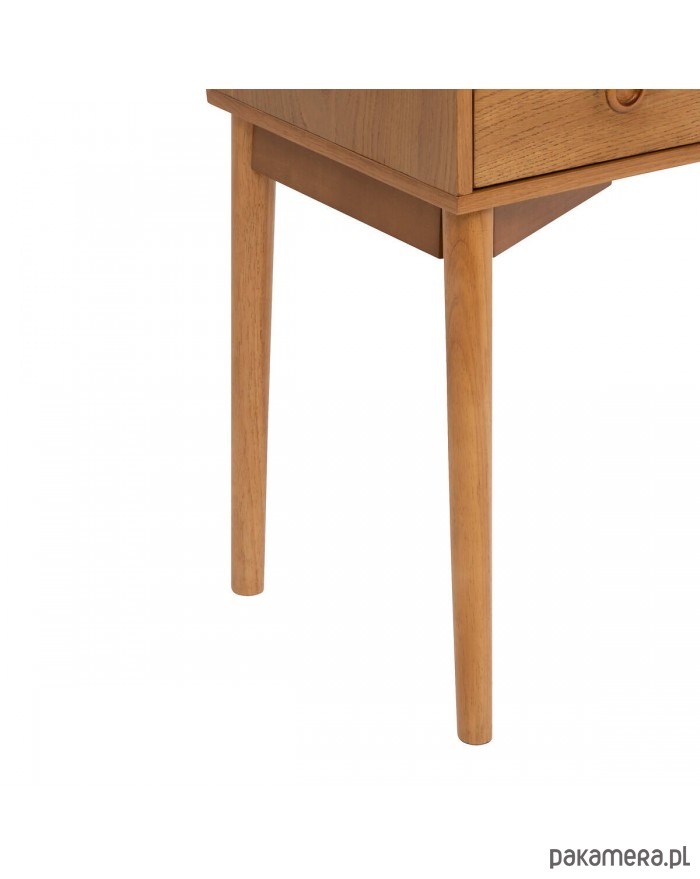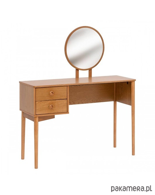 Toaletka z okrągłym lustrem łączy w sobie czyste linie i minimalistyczny design. Dwie boczne szuflady oferują dużo miejsca na kosmetyki i akcesoria. Toaletka została wykonana z włókna drzewnego i drewna kauczukowego w kolorze drewna egzotycznego. Idealna do sypialni lub pokoju kąpielowego.