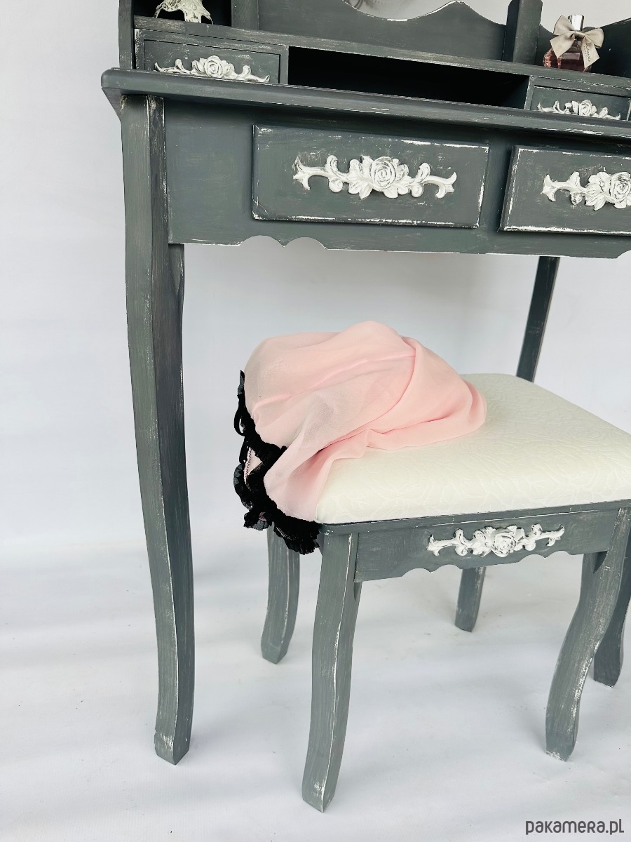 Niepowtarzalna toaletka kosmetyczna ze stołkiem i z dużym lustrem.Toaletka jest ręcznie malowana wysokiej jakości farbami kredowymi w kolorze szarości. Ale stylizacja może obejmować dowolną kolorystykę. Stołek zrobiony jest w wiktoriańskim stylu.Toaletka posiada zaokrąglone nogi i unikalne zdobienia wykonane z niebywałą precyzją.Cztery szuflady pomieszczą bardzo dużą ilość art. kosmetycznych.