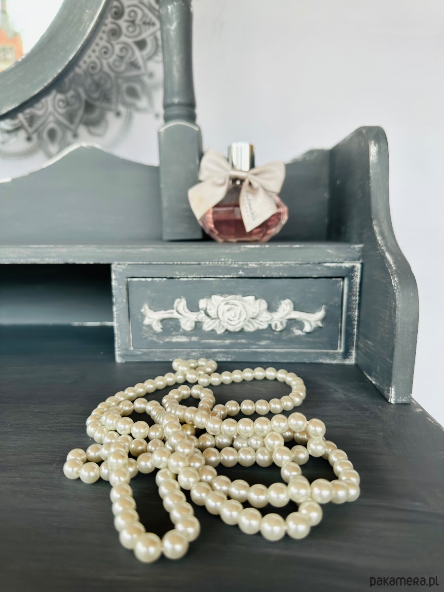 Toaletka jest ozdobiona techniką shabby chic, wszelkie przetarcia, „niedomalowania” to cechy charakterystyczne tego stylu.