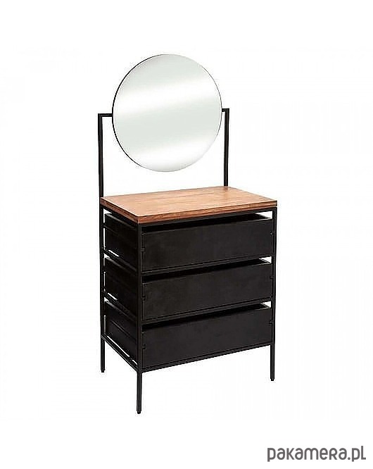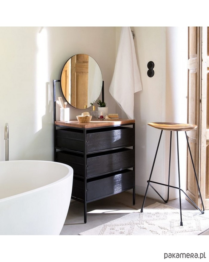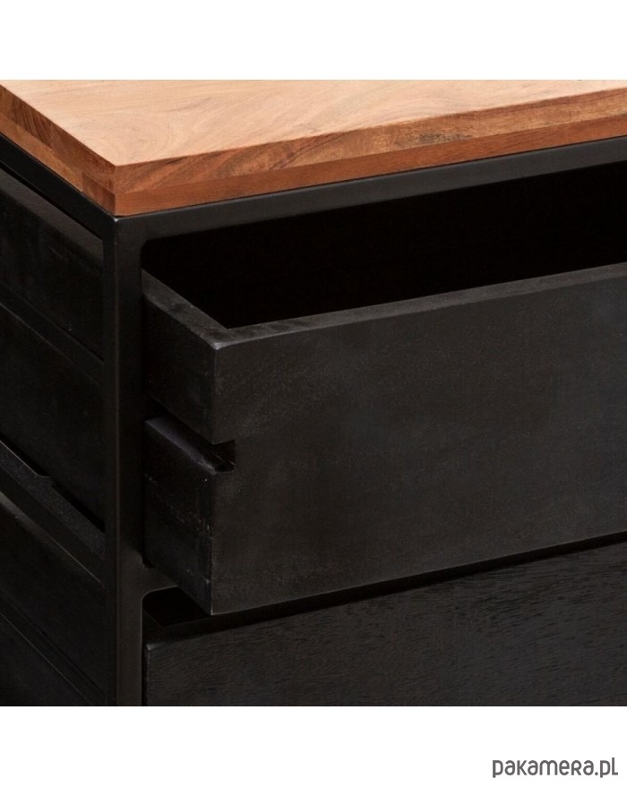 Urocza komoda wraz z lustrem. Konstrukcja została wykonana z metalu w kolorze czarnym. Materiał wierzchni wykonano z drewna akacji. Wnętrze szuflad to drewno mango. Całość celowo nieidealna.