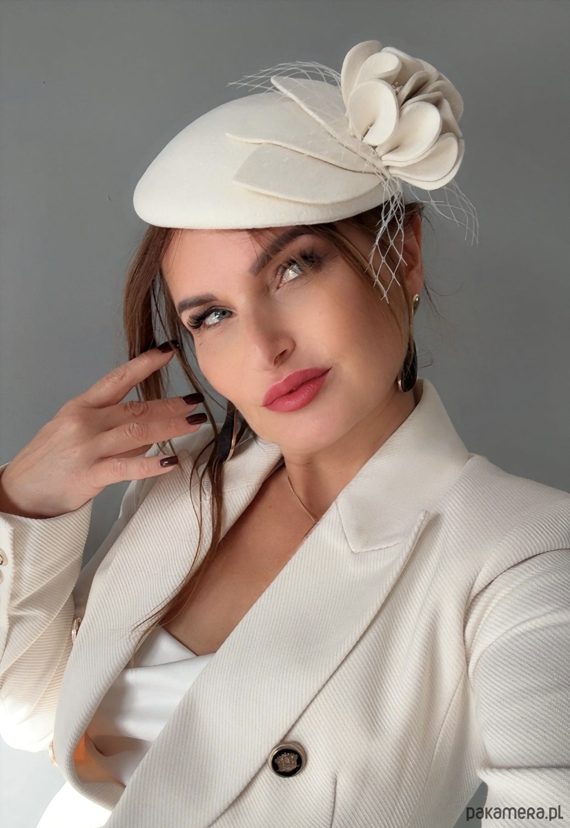 Przepiękny wełniany 100% toczek /fascynator /ozdoba na głowę w kolorze ecru .Piękny i elegancki dodatek do kreacji , doskonały na różne okazje może ślub. Wykonany profesjonalnie , ze szczególną starannością i dbałością o każdy szczegół . Mocowany na elastyczną gumkę oraz dwa delikatne grzebyki.