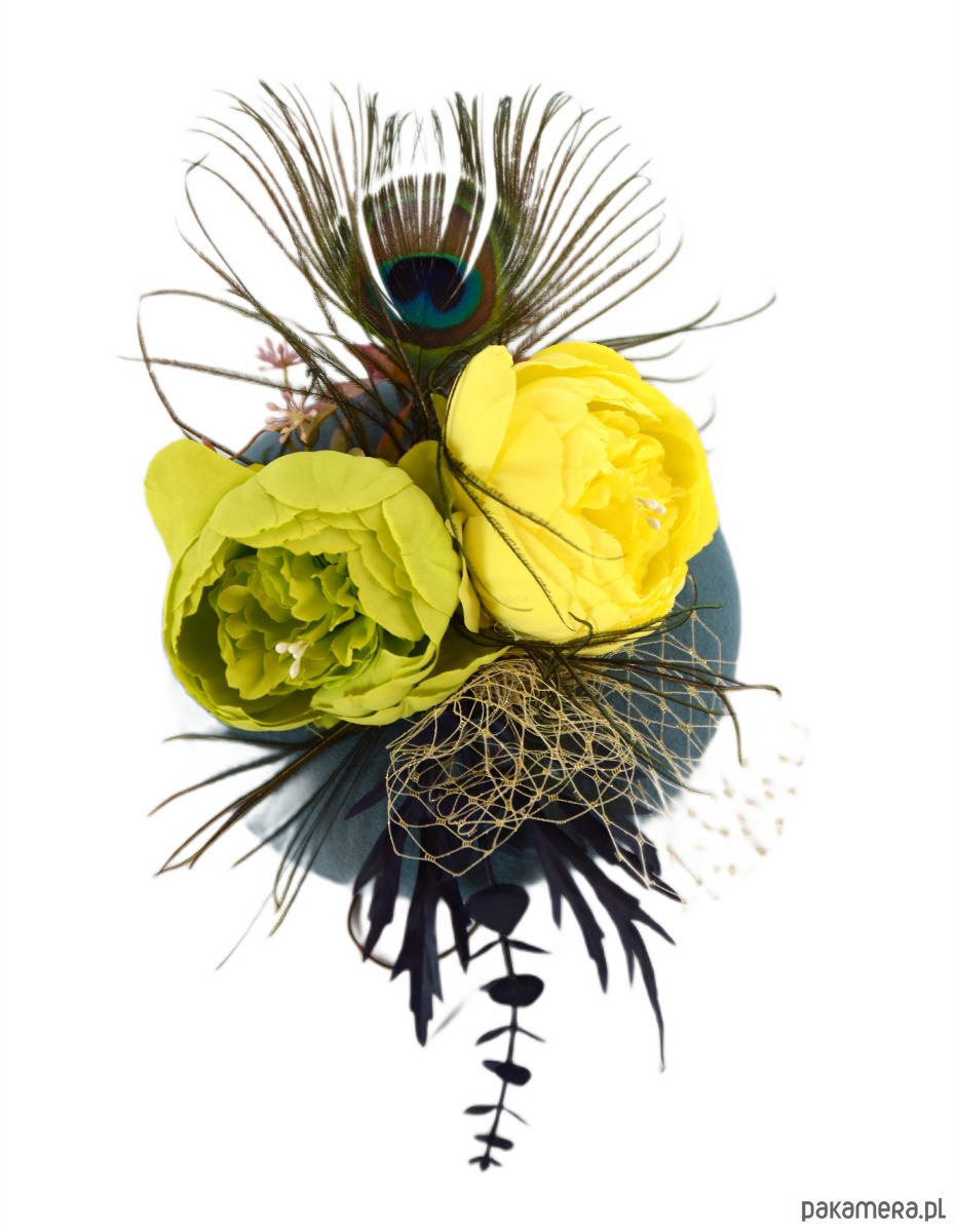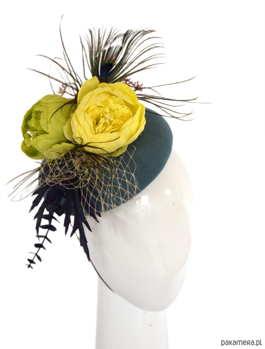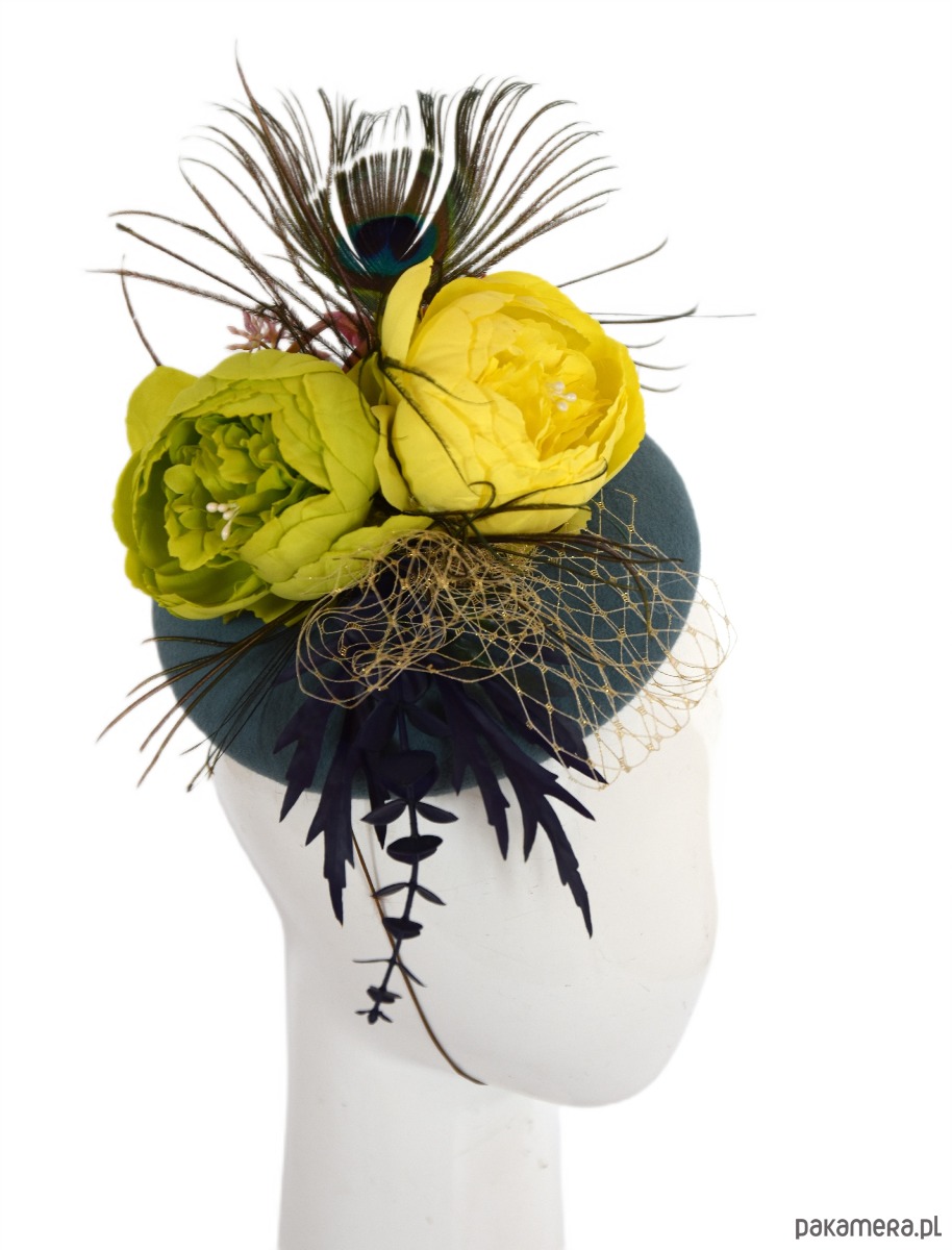 Toczek wykonany z filcu w kolorze szarym. Zdobiony kwiatami w żółym i limonkowym kolorze, woalką. Mocowany na gumce kapeluszowej. Średnica 20zcm