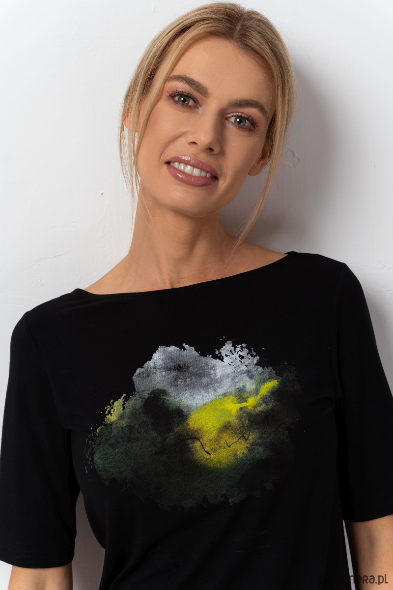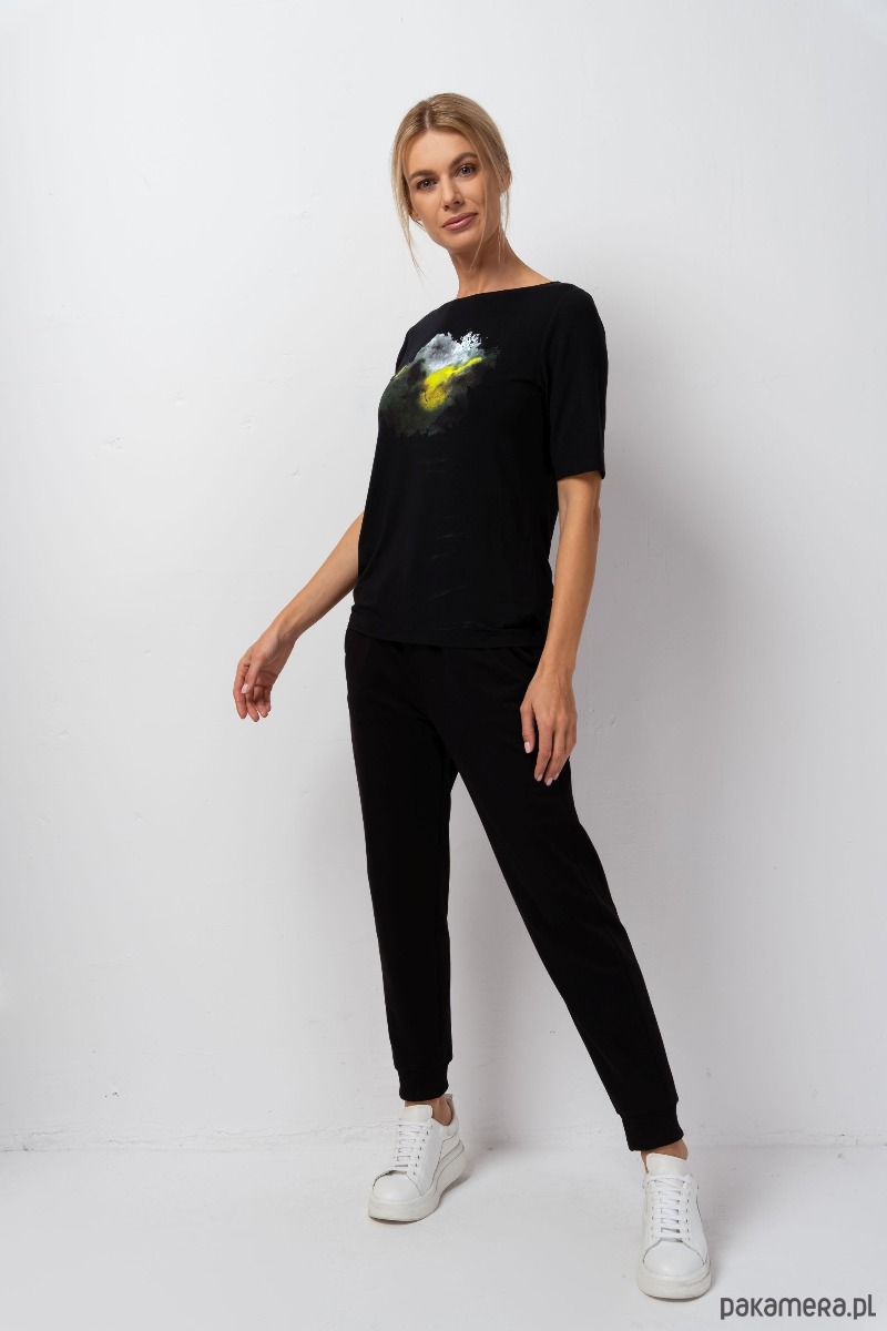 Czarna bluzka o klasycznym fasonie t-shirt z rękawami do łokcia i dekoltem w łódkę. Uszyta z wysokogatunkowej dzianiny z mikromodalu. Na przodzie grafika nakładana metodą sitodruku, który zachowuje swoje właściwości mimo wielokrotnego prania. Krój lekko dopasowany.