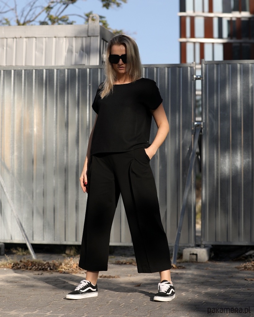 Wyjątkowo wygodnie szerokie spodnie typu culotte o długości 7/8. Wykonane z wysokogatunkowej dzianiny. Po bokach dwie cięte kieszenie. Przód spodni urozmaicają symetrycznie rozmieszczone szerokie zaszewki przechodzące w kant, który biegnie przez całą długość nogawki. Kant jest zaprasowany i dodatkowo przeszyty tak, żeby pozostał we właściwym miejscu. Góra wykończona ściągaczem. Dodatkowo w pasie wszyta szeroka guma. Spodnie są idealne na co dzień, ale będą też doskonałym wyborem na większe wyjście.