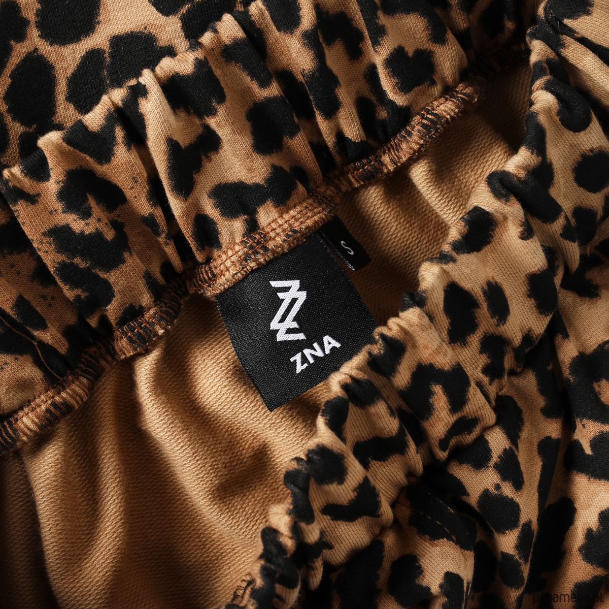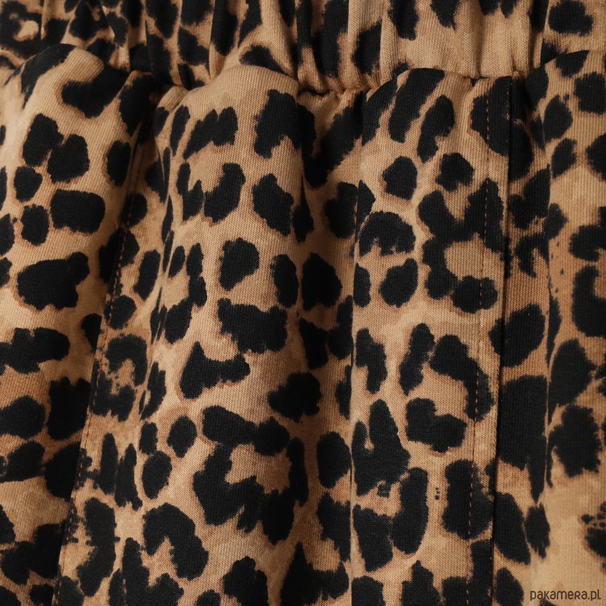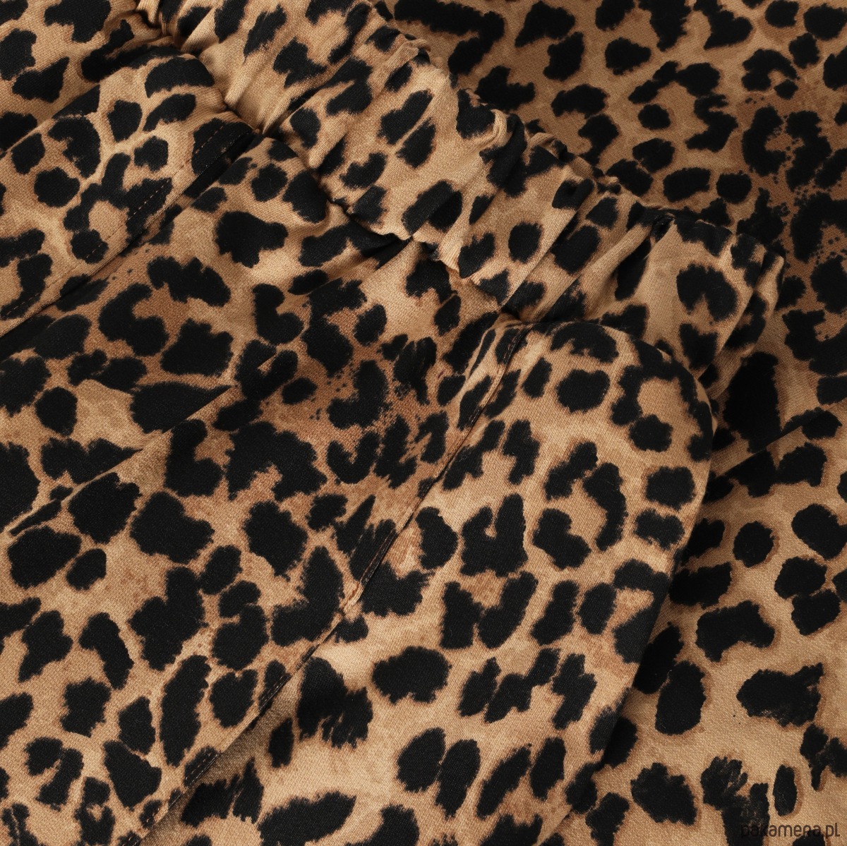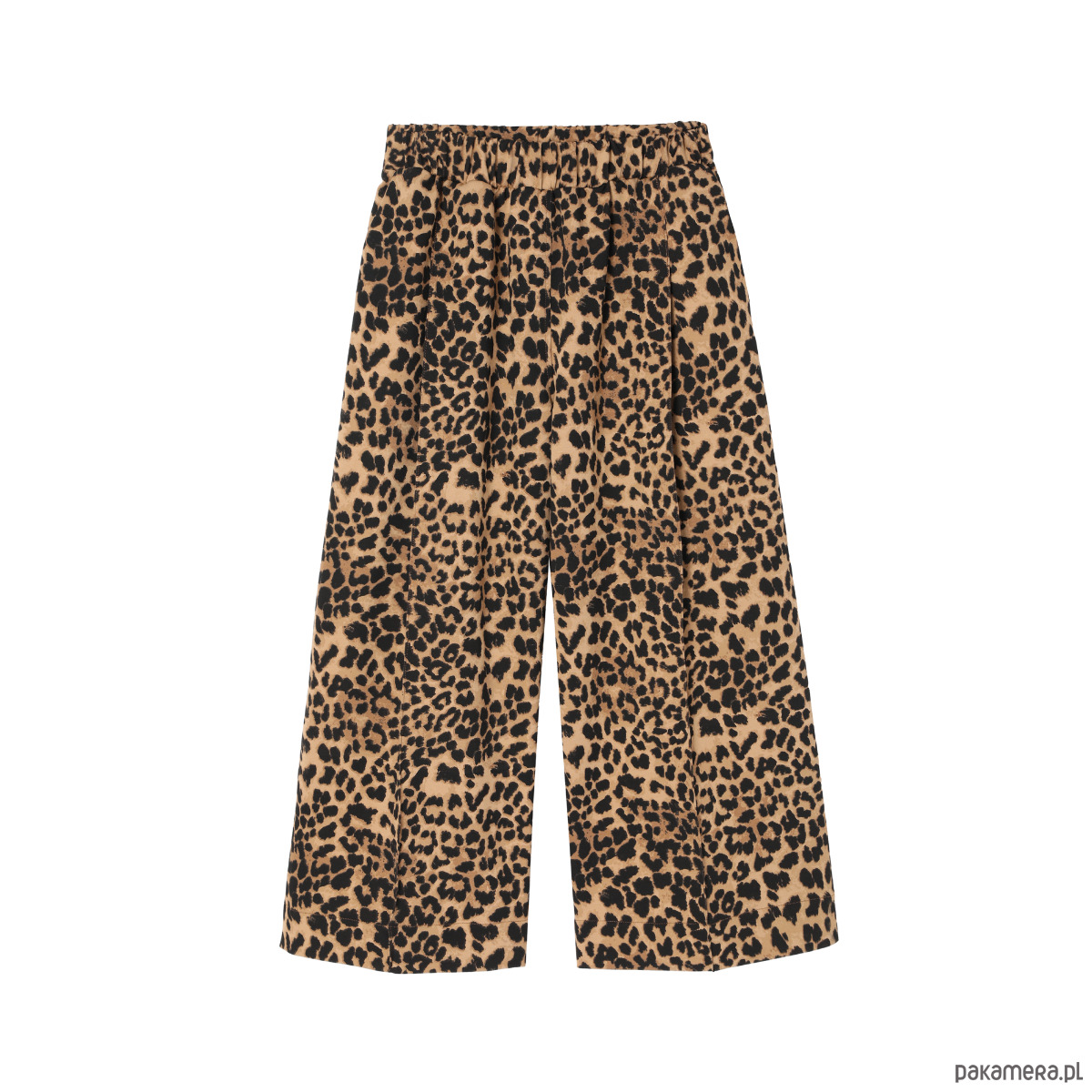 Wyjątkowo wygodne szerokie spodnie typu culotte o długości 7/8. Wykonane z wysokogatunkowej dzianiny z nadrukiem w cętki. Po bokach dwie cięte kieszenie. Przód spodni urozmaicają symetrycznie rozmieszczone szerokie zaszewki przechodzące w kant, który biegnie przez całą długość nogawki. Kant jest zaprasowany i dodatkowo przeszyty tak, żeby pozostał we właściwym miejscu. Góra wykończona ściągaczem. Dodatkowo w pasie wszyta szeroka guma.