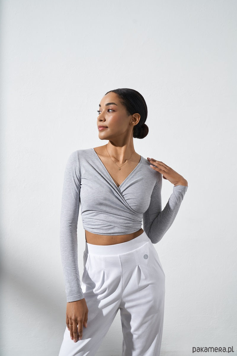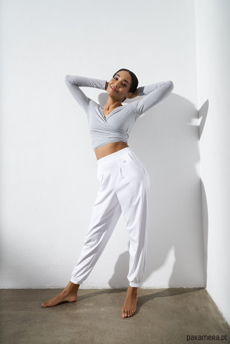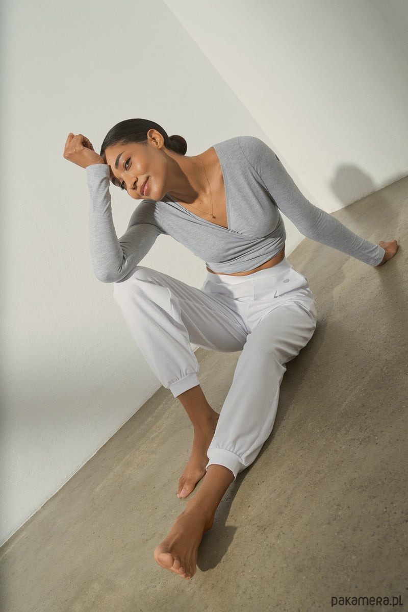 Top do jogi z dekoltem w kształcie litery V sprawia, że każda kobieta pięknie w niej wygląda. Kopertowe V z przodu wspaniale formuje biust, długie i wąskie rękawy są niezwykle przytulne, eliminują pocenie w trakcie praktyki a także sprawiają, że Twoje pozycje zyskują piękne i długie linie, zaś otwarty tył w kształcie trójkąta nadaje topowi niepowtarzalny charakter i wyjątkowość.