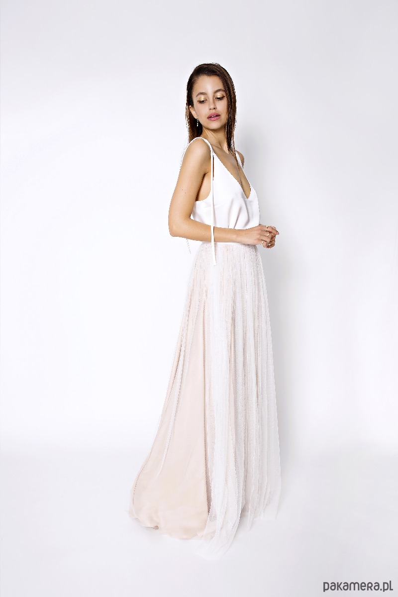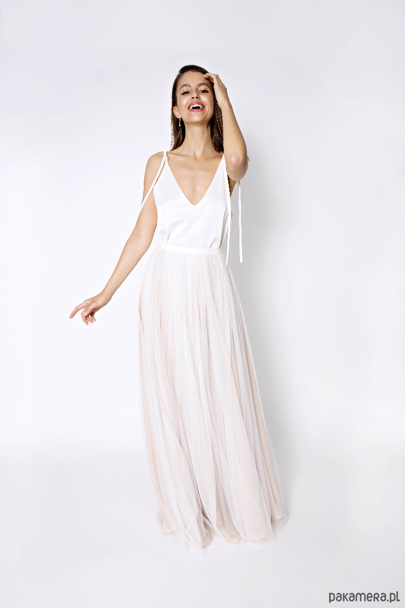 Top na wąskich naramkach. Tylna części lekko przedłużana. Pęknięcie w tylnym szwie. Na ramieniu znajduje się luźno wisząca szarfa szerokości 1,4 cm. Wykonany z lejącej tkaniny o satynowym splocie, posiada niewielki połysk.