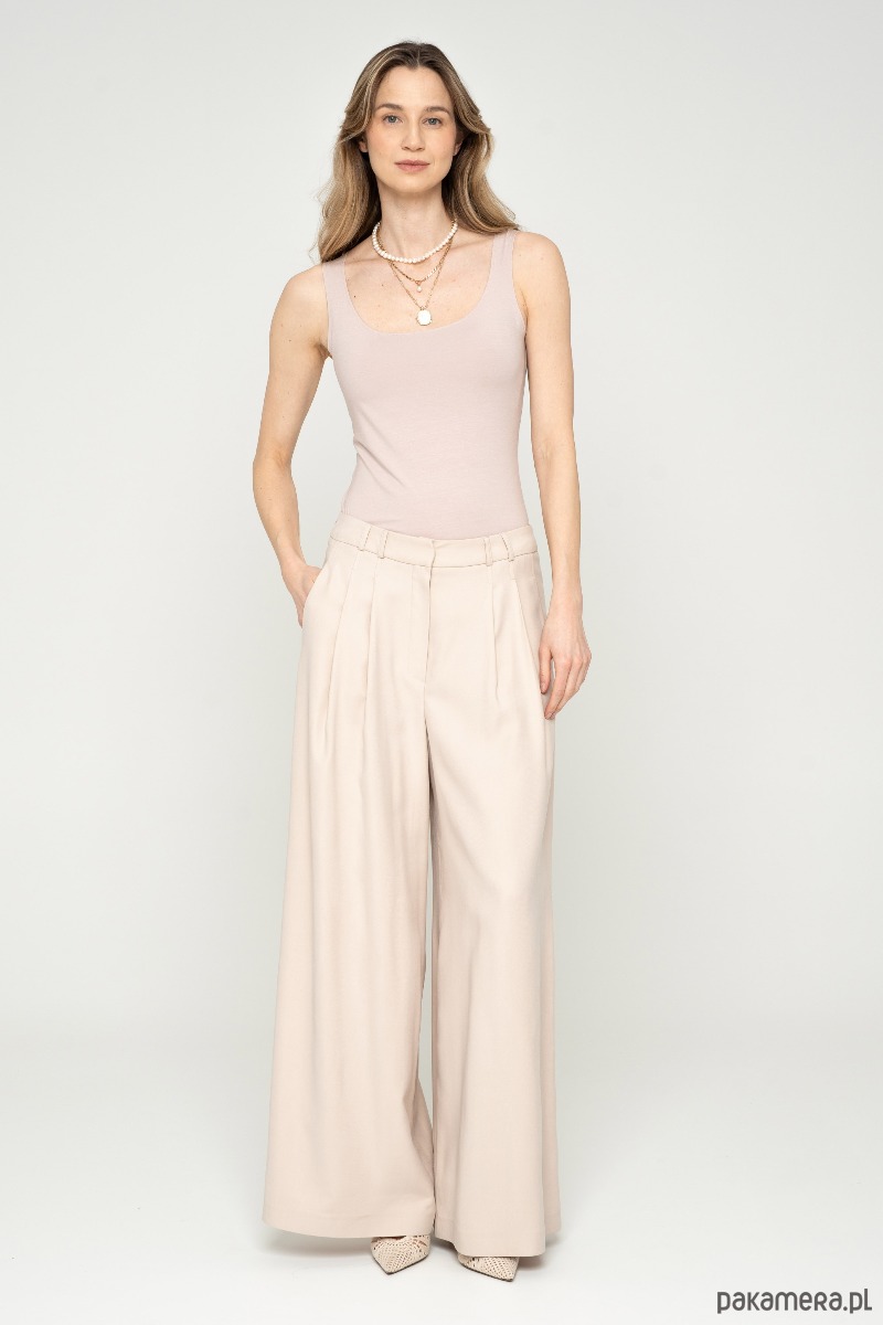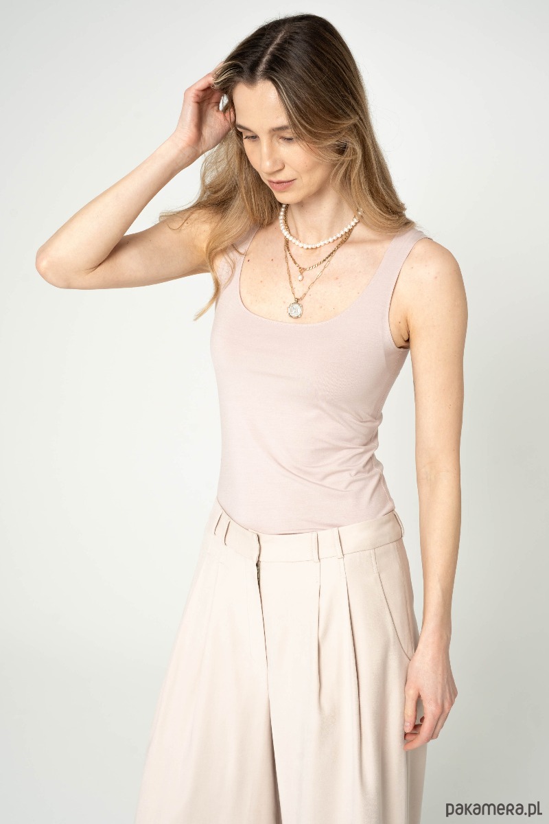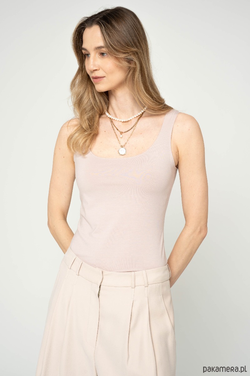 Top na szerokich ramiączkach z przyjemnej w dotyku modalowej dzianiny. Fason dopasowany. Można go zakładać na dwie strony z głębszym dekoltem i płytkim. Idealne uzupełnienie klasycznej stylizacji, ubierz go pod marynarkę lub sweter. Sprawdzi również się w codziennych stylizacjach.