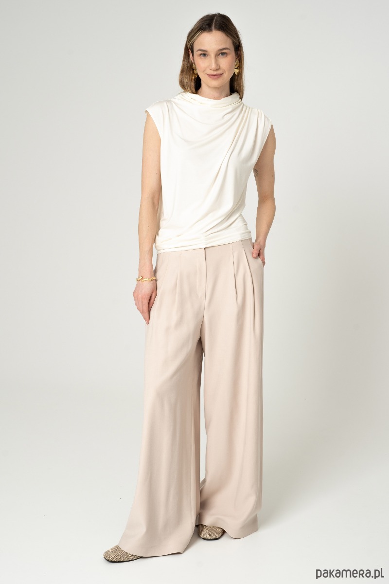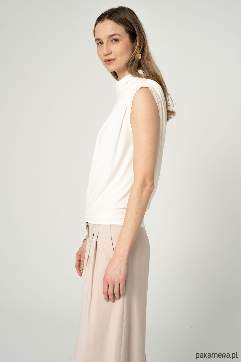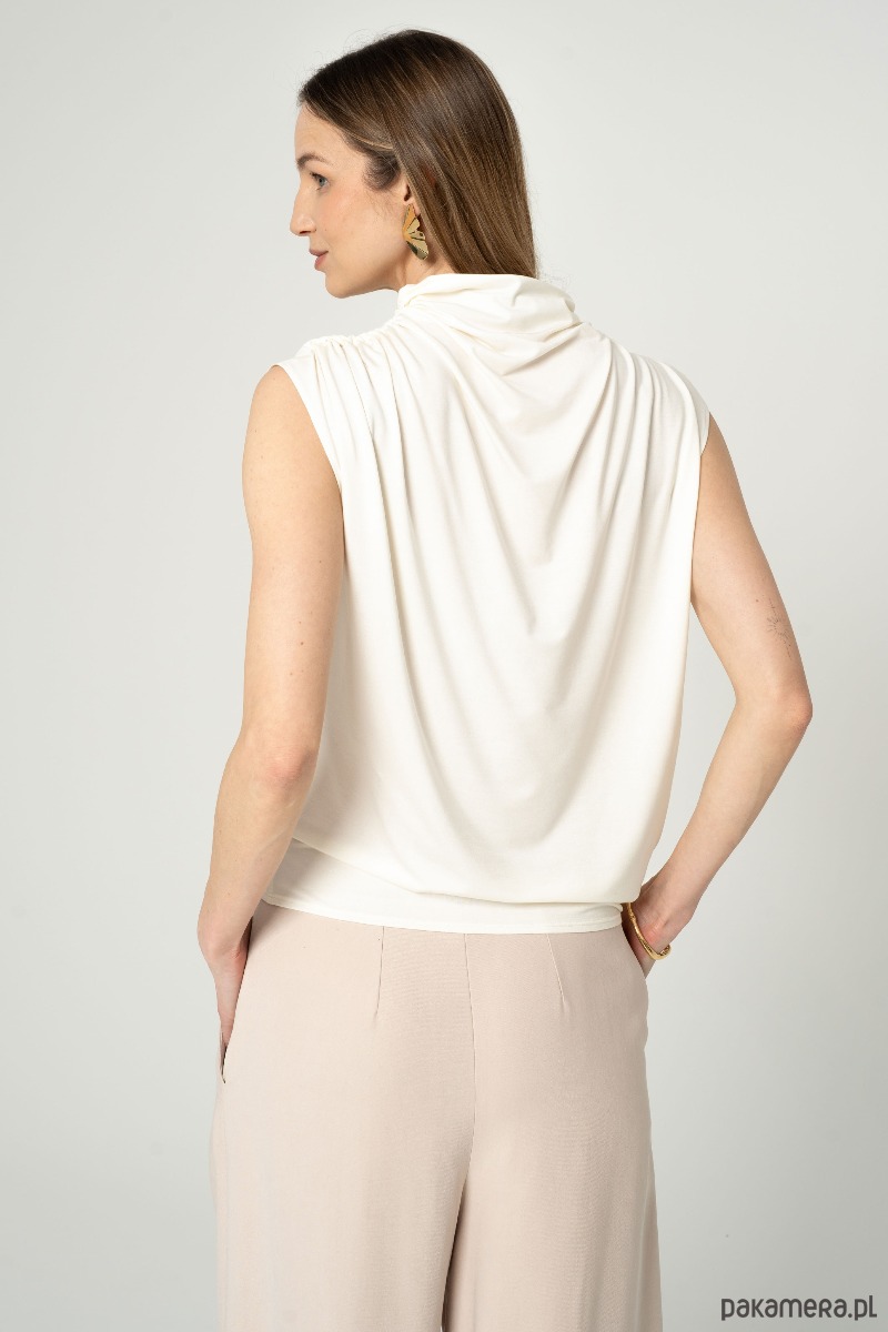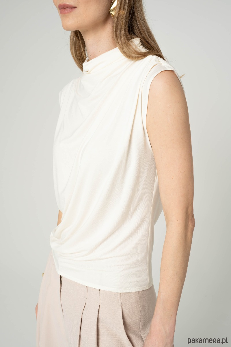 Top No.2/9 to luźna forma z szerokimi ramiączkami. Woda z przodu i na ramionach. Drapowanie po boku ukrywa niedoskonałości sylwetki. Uszyty z przyjemnej w dotyku modalowej dzianiny.