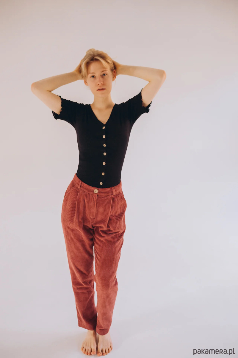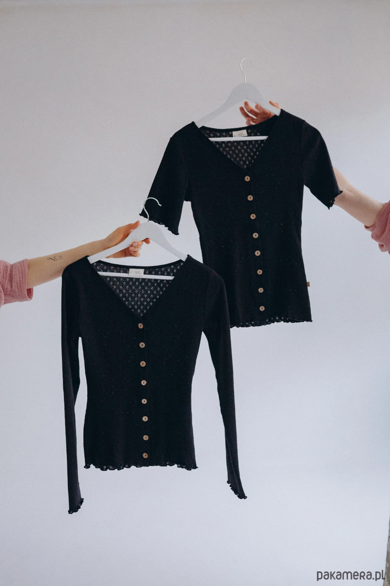 Falbanki nigdy nie były tym, co musiały mieć nasze projekty, ale tutaj – nie mogliśmy się oprzeć. Ale poza tym, że Mellow jest po prostu urocza, jest też niesamowicie praktyczna…Mellow uszyliśmy z dzianinowej bawełny z ażurowym wzorem i wykończyliśmy delikatnymi falbankami. Nie dość, że jest uroczy, to jeszcze niesamowicie praktyczny dzięki kokosowym guzikom na całej długości. Możesz za ich pomocą łatwo regulować głębokość dekoltu albo rozpiąć go zupełnie i nosić jak narzutkę.