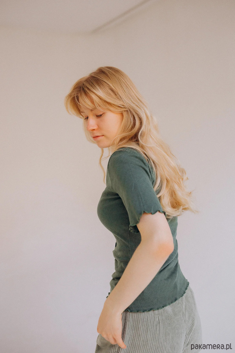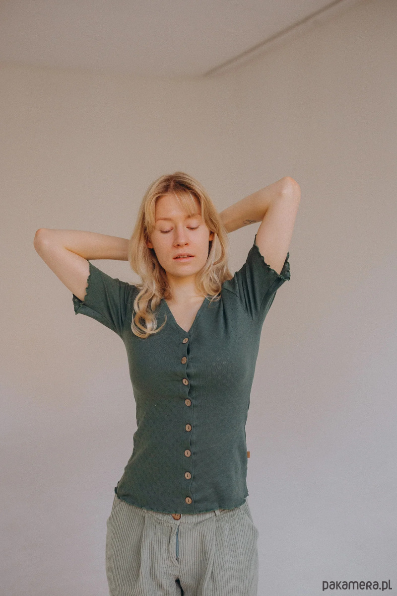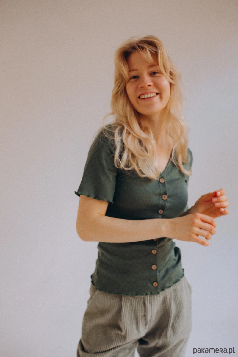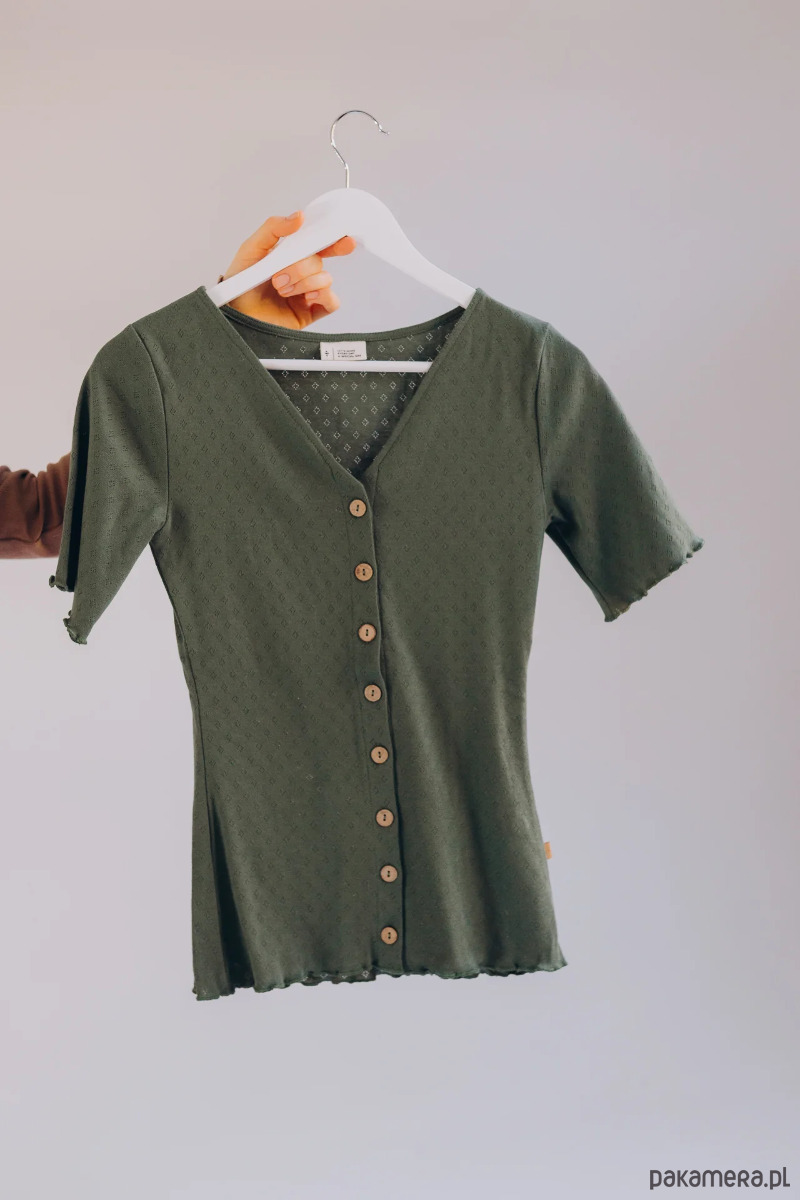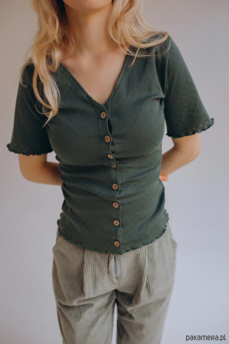 Falbanki nigdy nie były tym, co musiały mieć nasze projekty, ale tutaj – nie mogliśmy się oprzeć. Ale poza tym, że Mellow jest po prostu urocza, jest też niesamowicie praktyczna…Mellow uszyliśmy z dzianinowej bawełny z ażurowym wzorem i wykończyliśmy delikatnymi falbankami. Nie dość, że jest uroczy, to jeszcze niesamowicie praktyczny dzięki kokosowym guzikom na całej długości. Możesz za ich pomocą łatwo regulować głębokość dekoltu albo rozpiąć go zupełnie i nosić jak narzutkę. Mellow połącz ze sztruksowymi spodniami Totally.