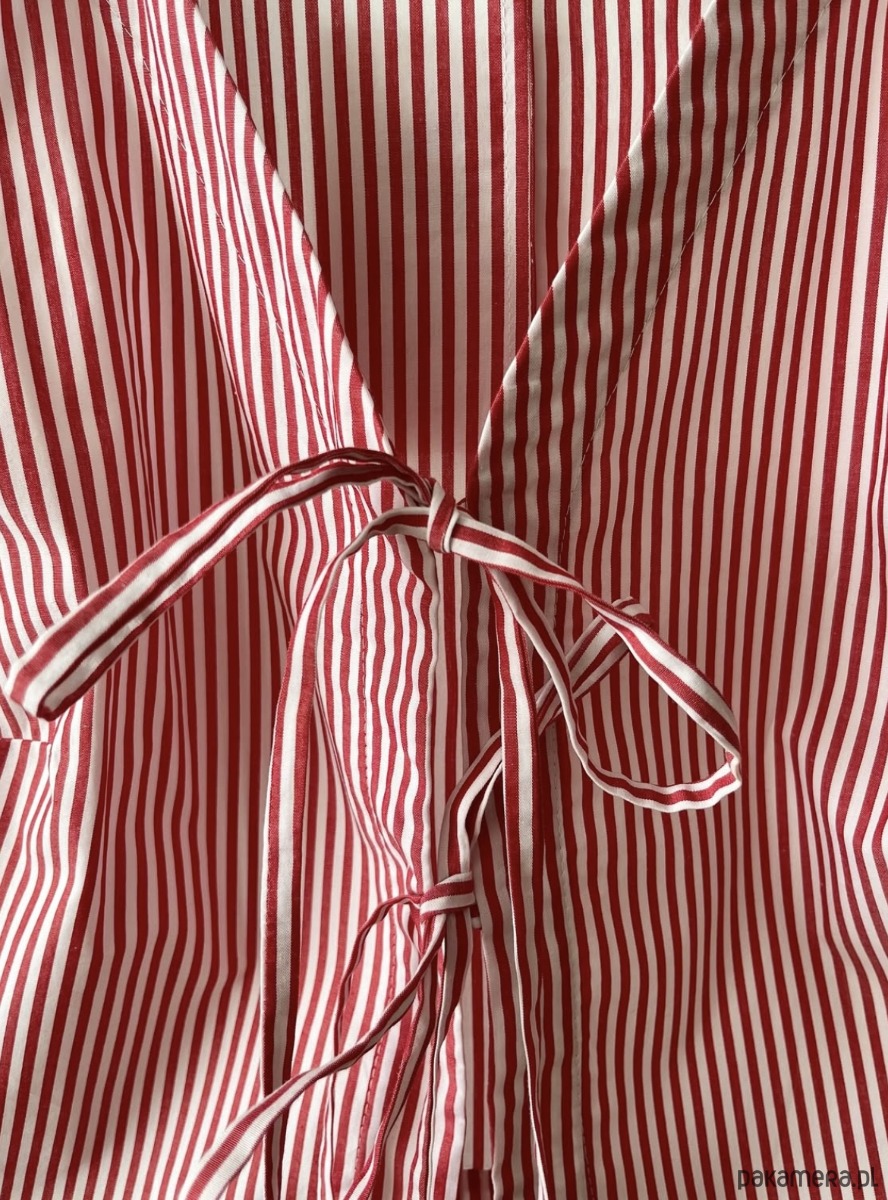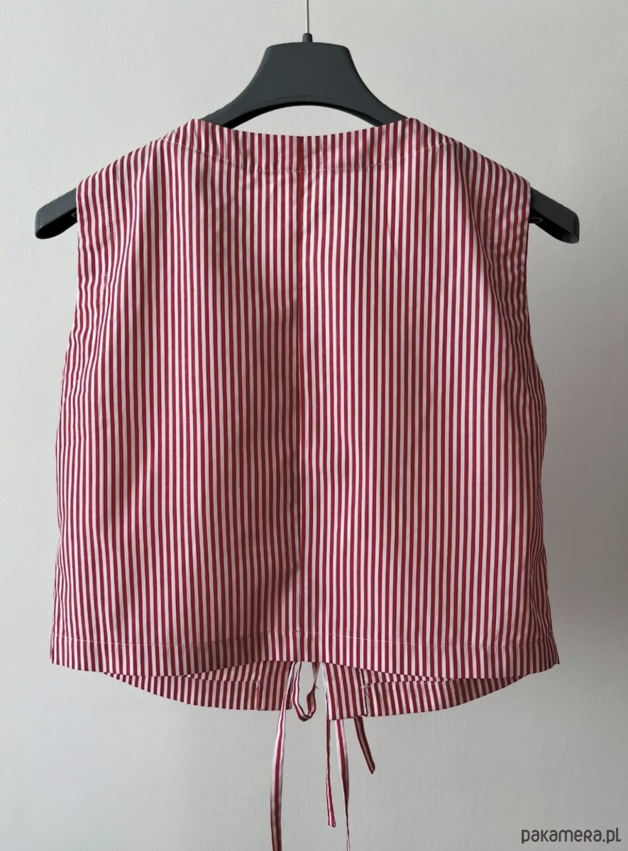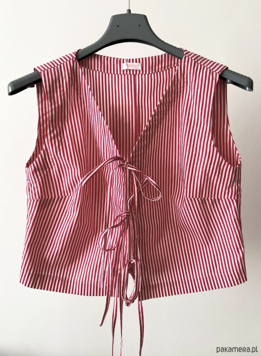 Zamiast guzików ma urocze sznureczki do wiązania, które dodają mu lekkości i oryginalnego charakteru.