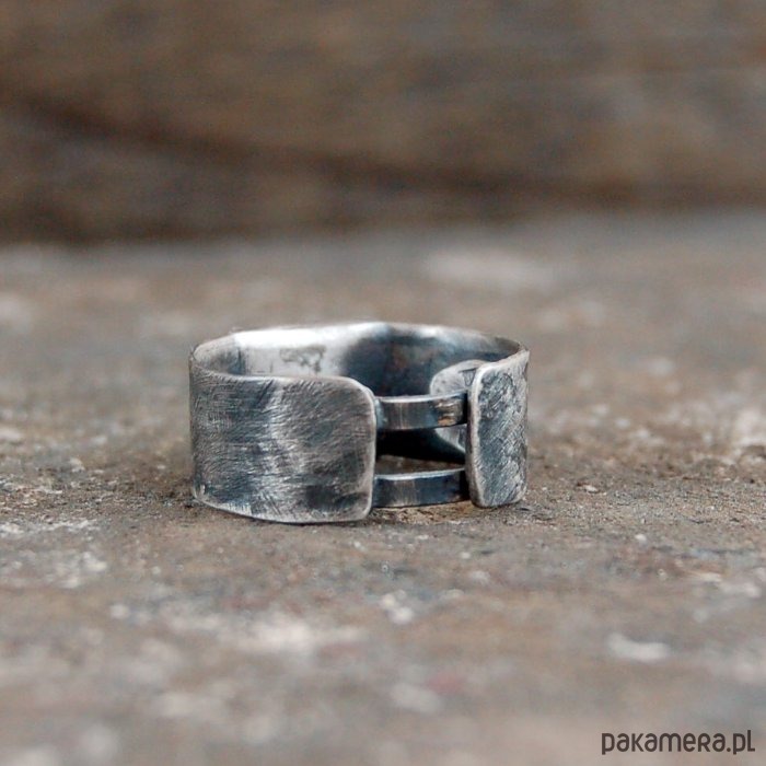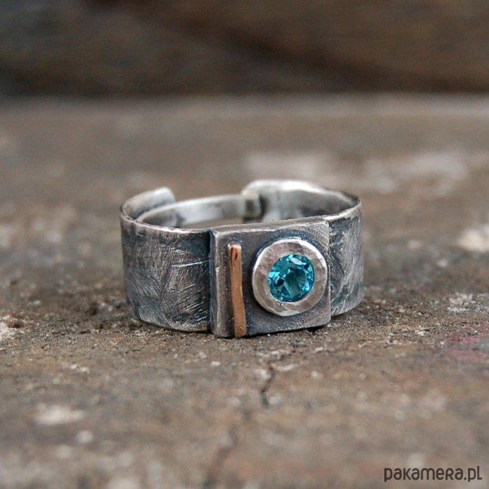 Pierścionek ze srebra, złota próby 585 i topazu swiss blue. Srebro oksydowane. Wielkość kamienia 0,4 cm, szerokość obrączki 0,9 cm, rozmiar regulowany w zakresie 12 - 24. Przy zamówieniu proszę o podanie rozmiaru, pierścionek zostanie odpowiednio ustawiony.
