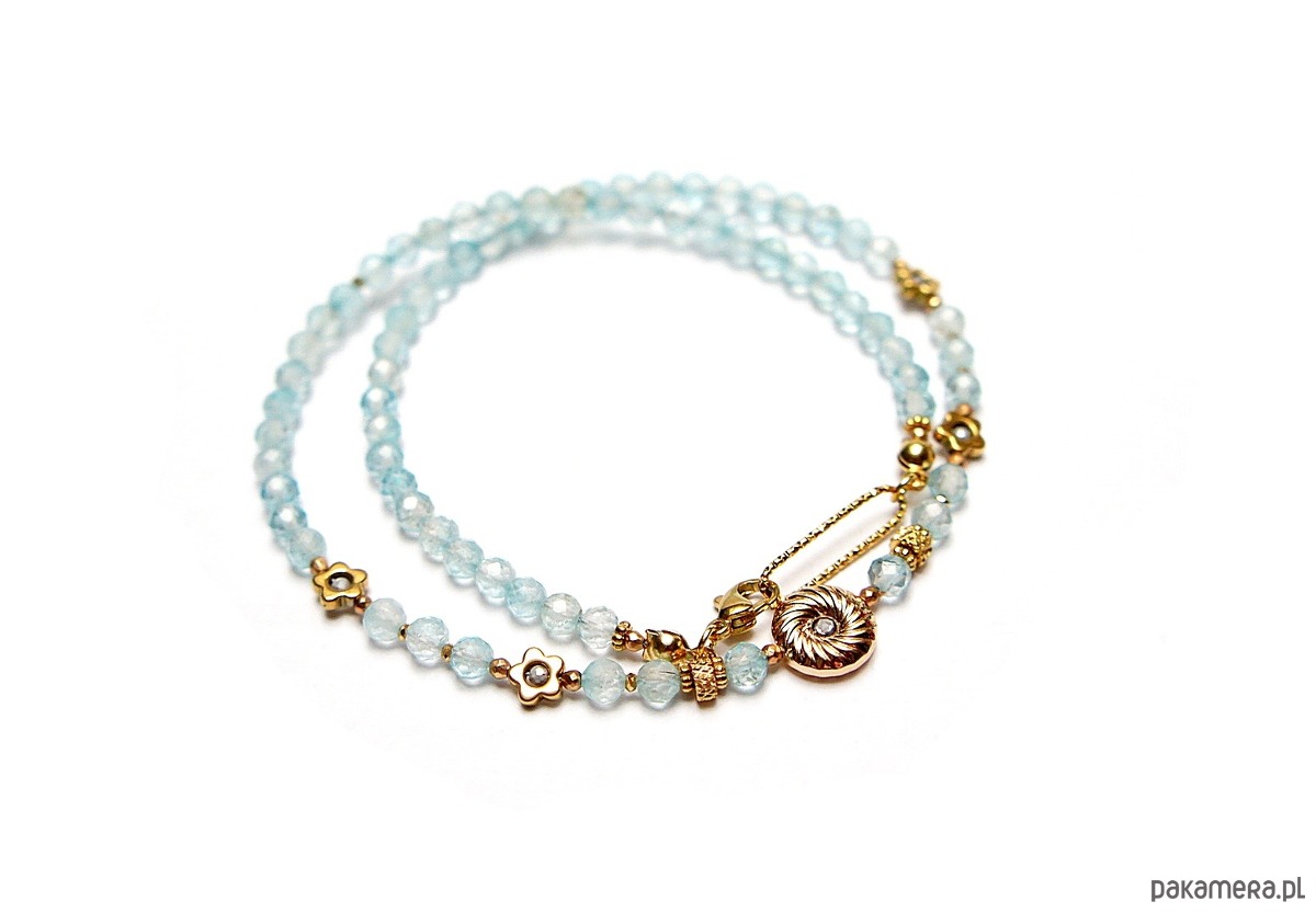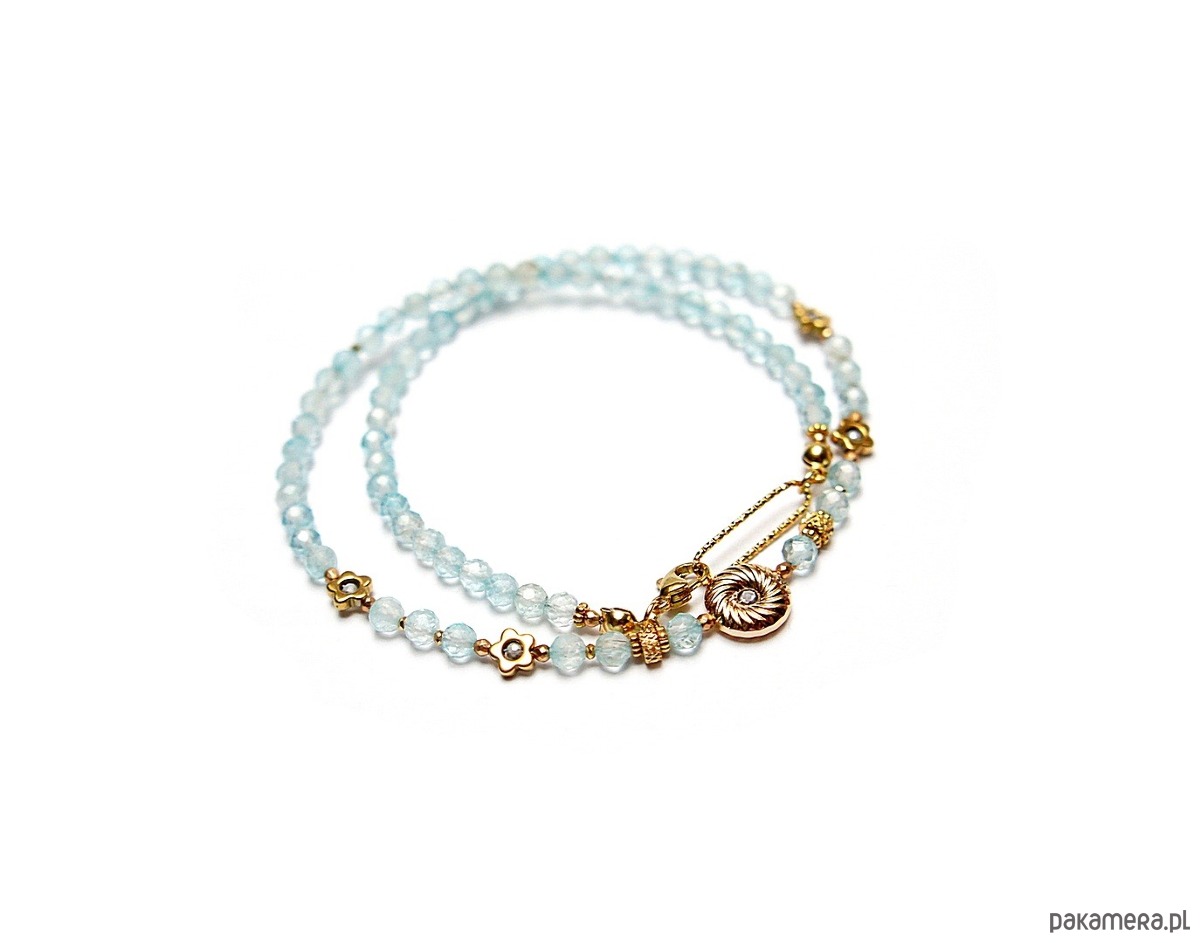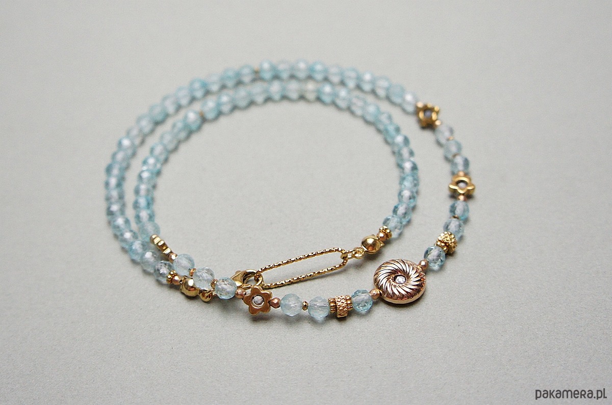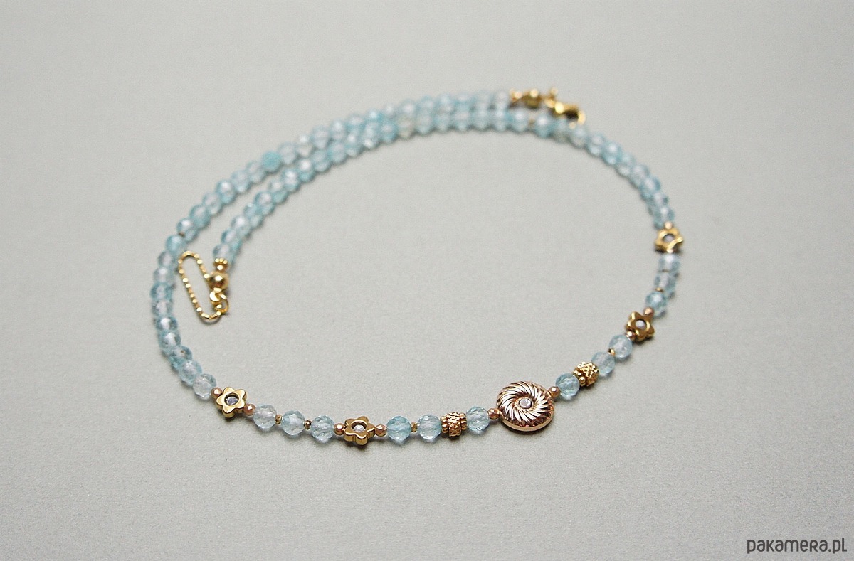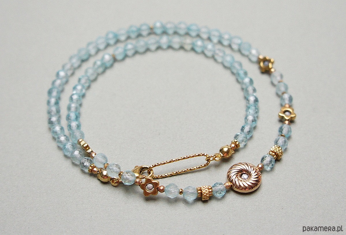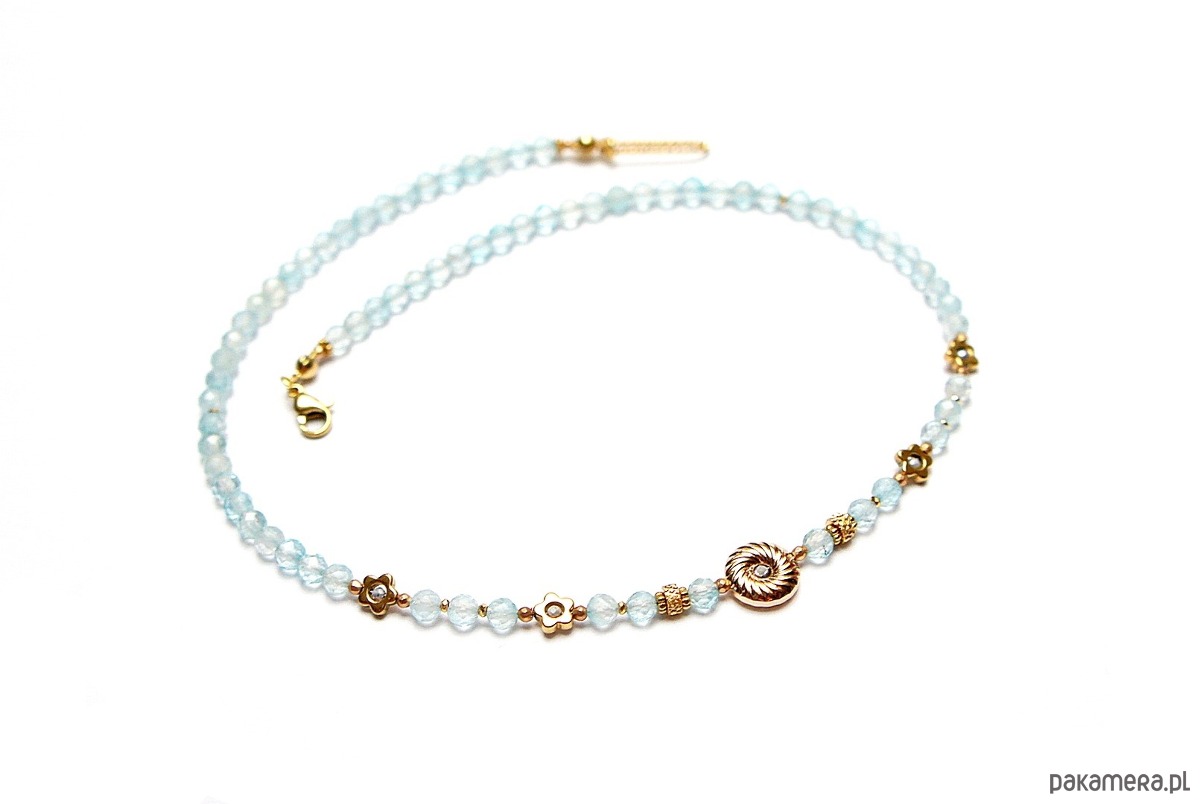 Krótki, delikatny naszyjnik wykonany w całości z pozłacanej stali szlachetnej oraz naturalnych, szlachetnych kamieni - fasetowanych kuleczek blue topazu [ok. 4mm], fasetowanych szafirów w błękitnym kolorze [1,5mm] fasetowanych hematytów platerowanych [2mm], przekładek z hematytu [1mm; 6mm - kwiatki], hematytu w kształcie donatu. Naszyjnik o długości ok.42cm.