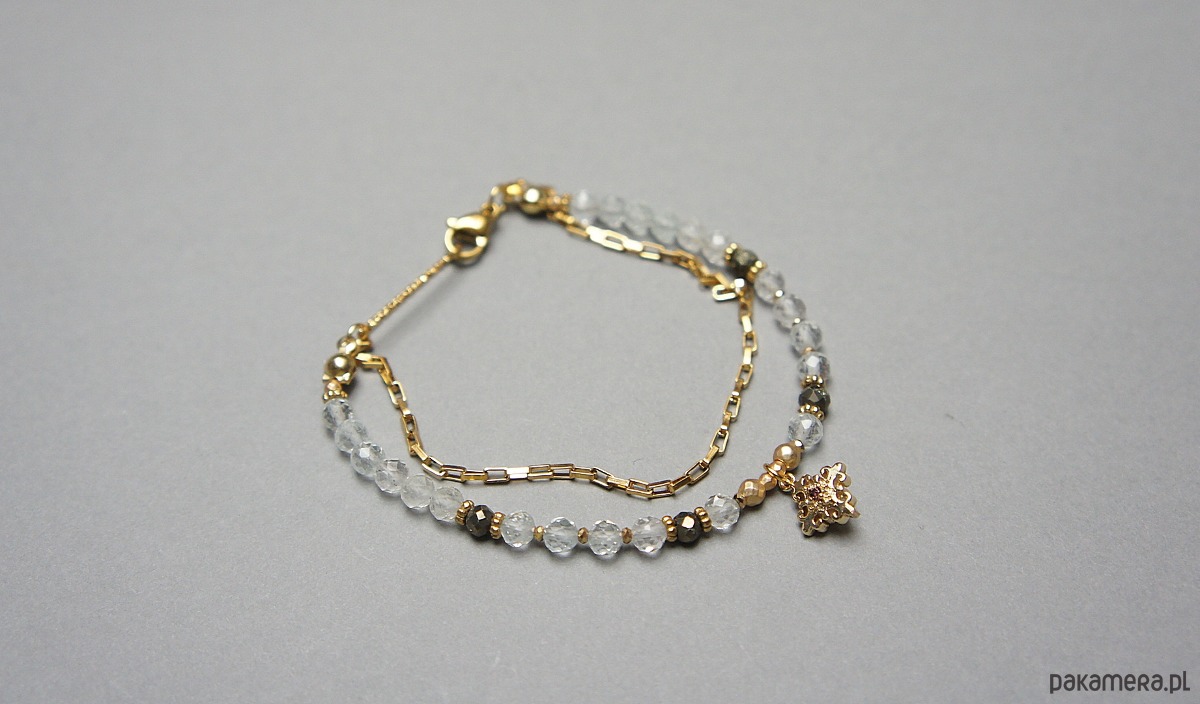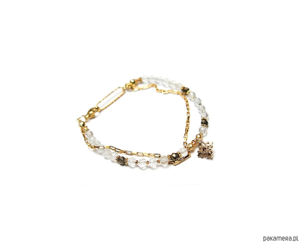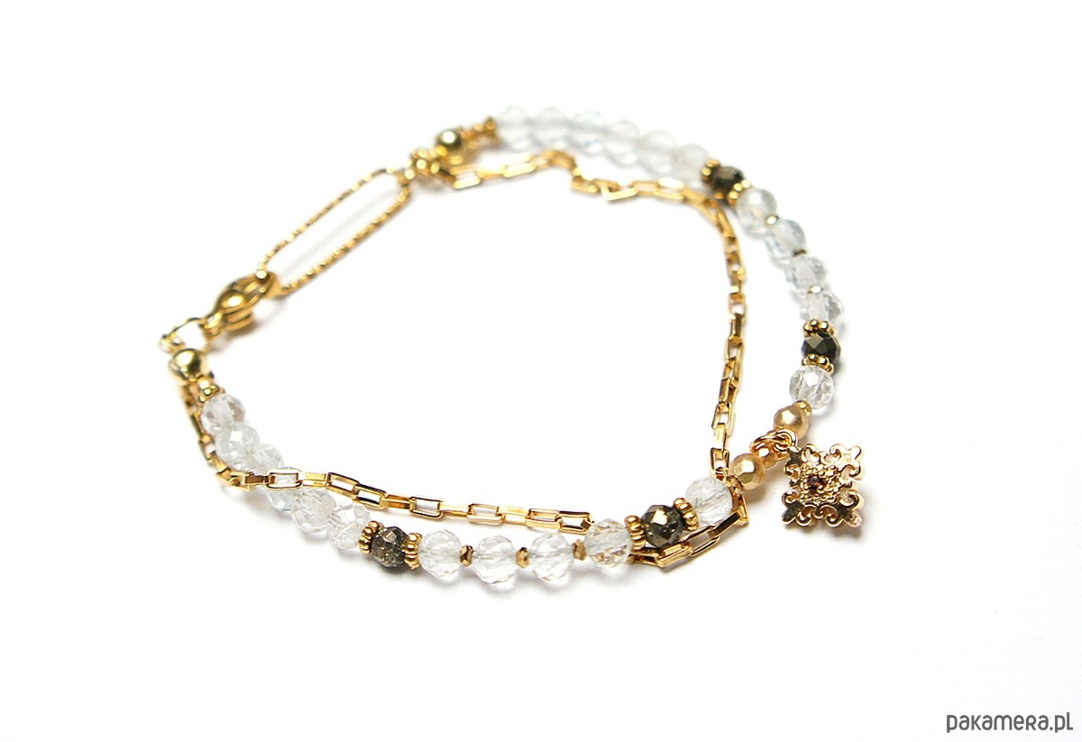 Delikatna bransoletka wykonana w całości ze stali szlachetnej pozłacanej oraz naturalnych, szlachetnych kamieni - fasetowany topaz [4mm], fasetowany piryt o surowym wyglądzie [3mm], hematyt fasetowany, platerowany o matowej powłoce [2mm i 3mm], zawieszki z mosiądzu platerowanego z cyrkonią.