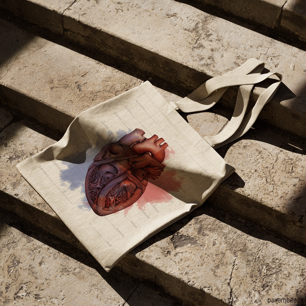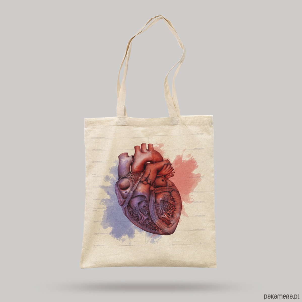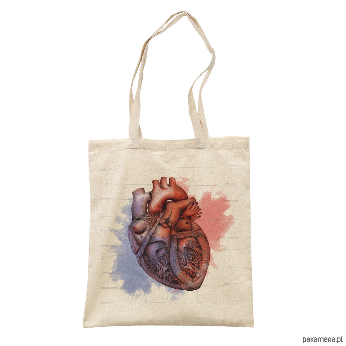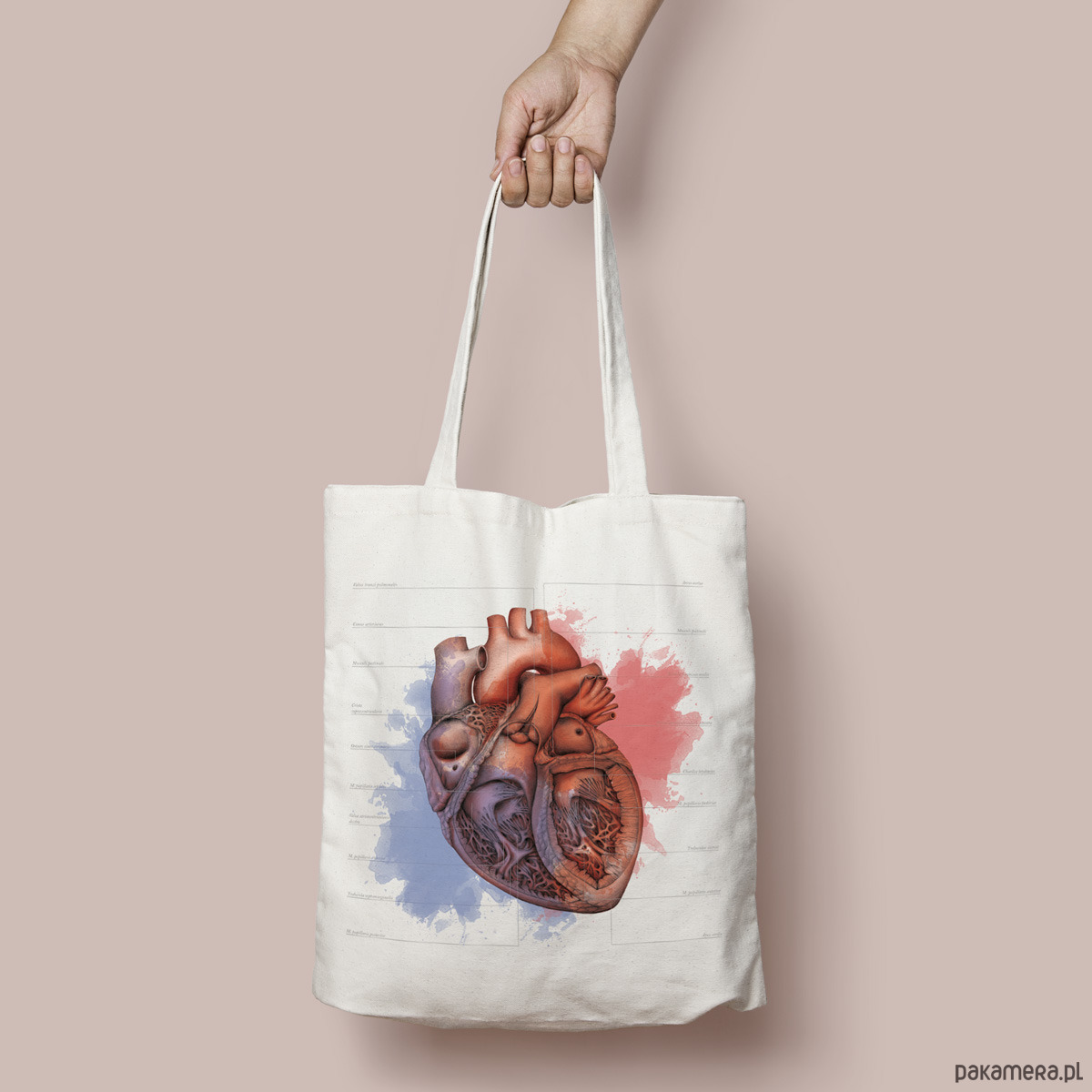 Stylowa torba na ramię z anatomicznie poprawną ilustracją serca i łacińskimi podpisami struktur. Wysoka gramatura (220 g) gwarantuje trwałość, a naturalny kolor ecru pasuje do każdej stylizacji. Ilustracja została wykonana ręcznie przez profesjonalną ilustratorkę medyczną. Produkt w całości wyprodukowany w Polsce, pod Krakowem.