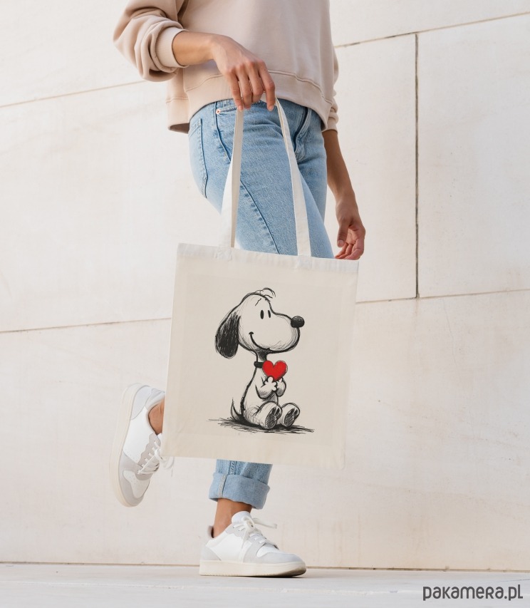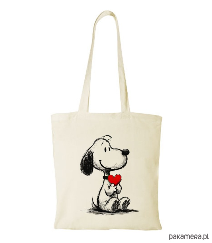 Ekologiczna torba bawełniana z grafiką psa trzymającego serce. Pies przypomina znanego nam psa z kreskówki.