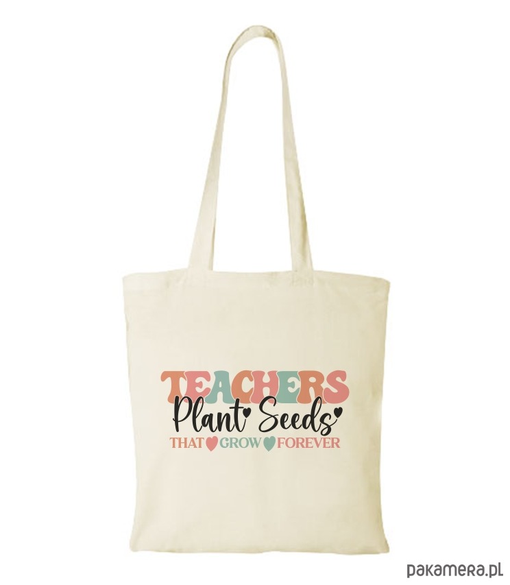 Ekologiczna torba bawełniana dla nauczyciela z hasłem: "Teachers plant seeds that grow forever (Nauczyciele sieją nasiona, które rosną wiecznie)" . Idealny wzór na prezent dla nauczyciela.