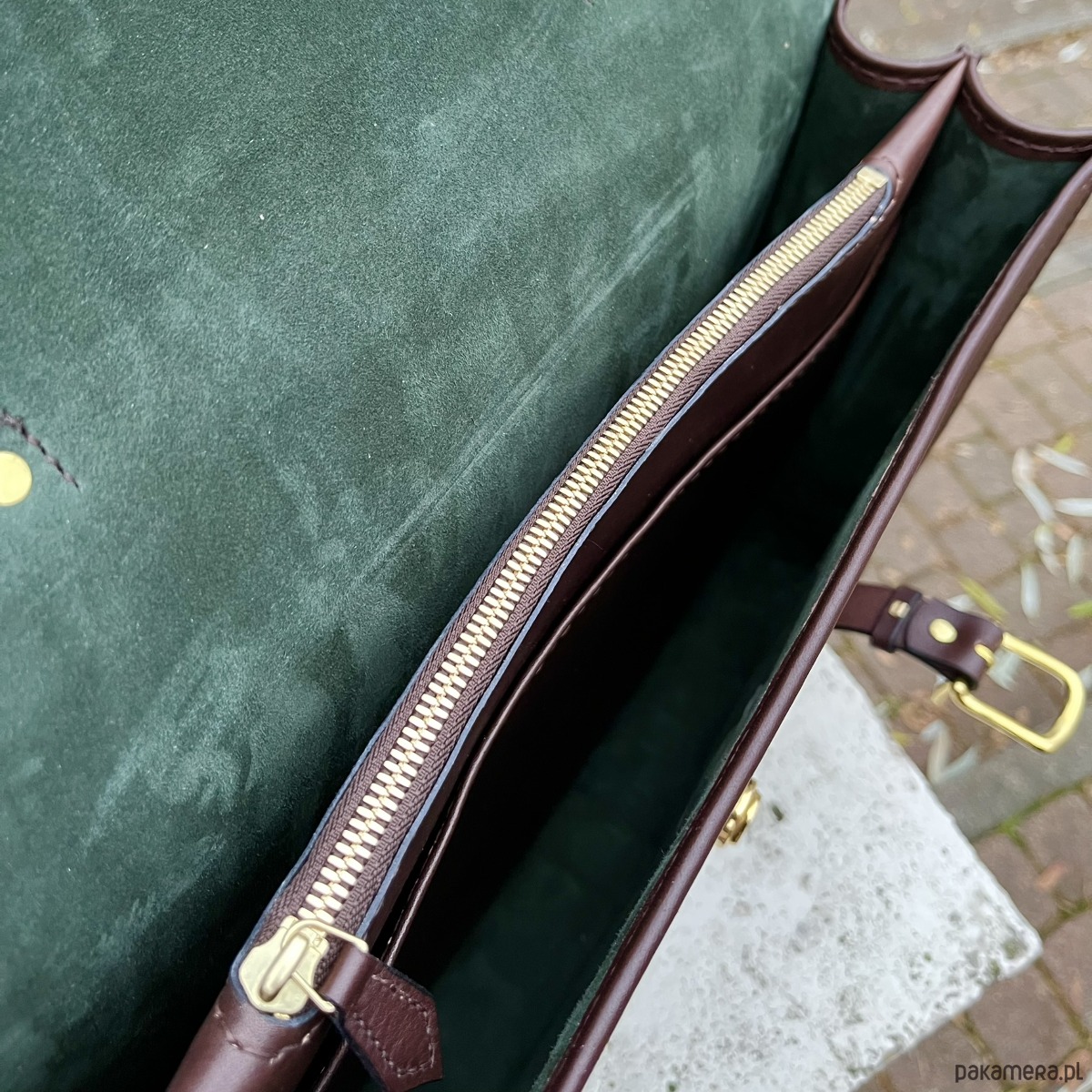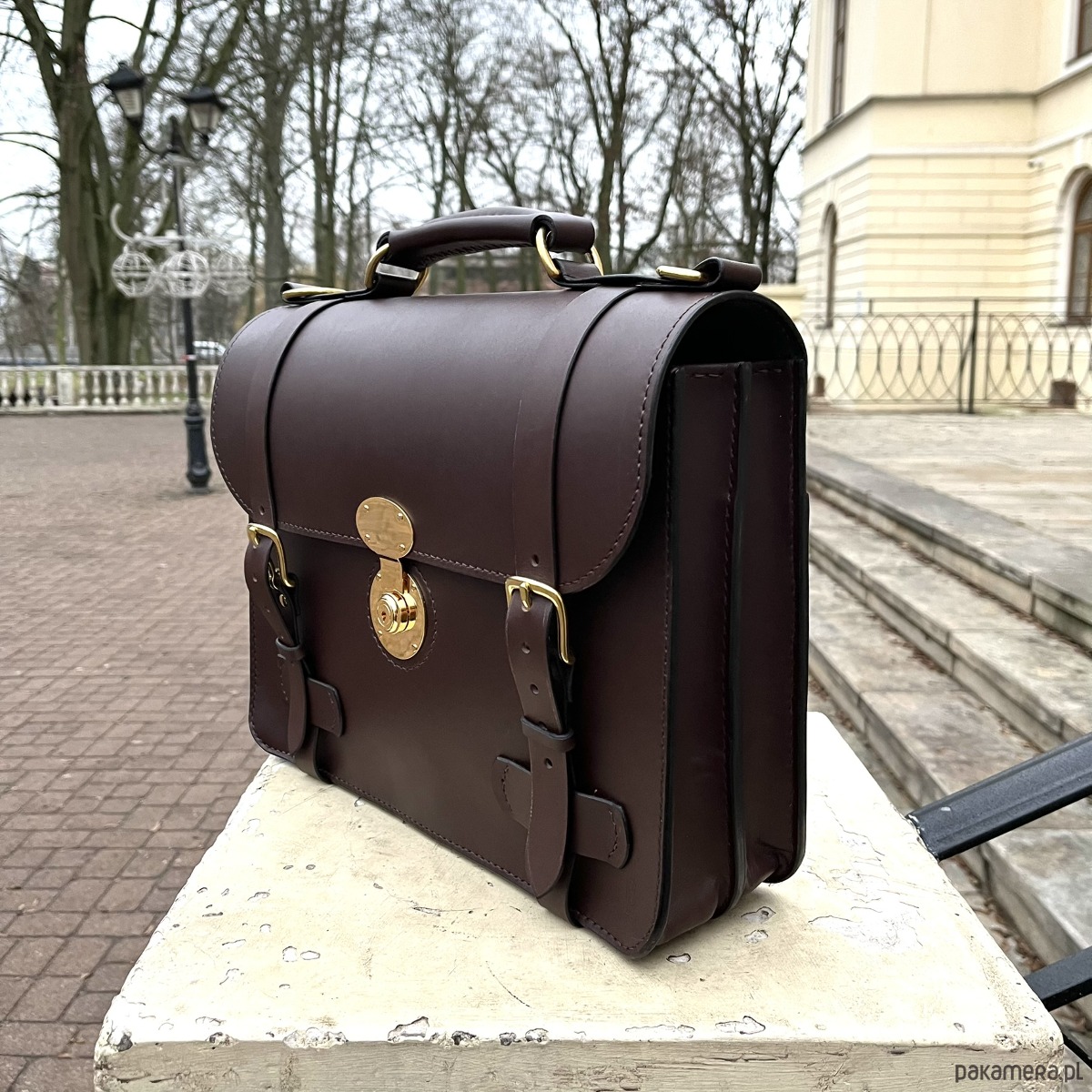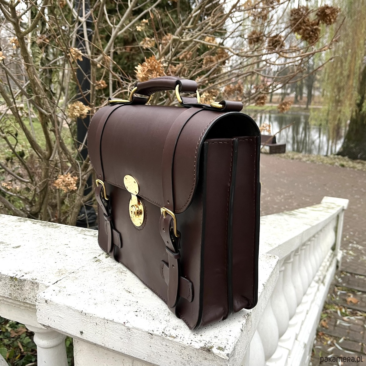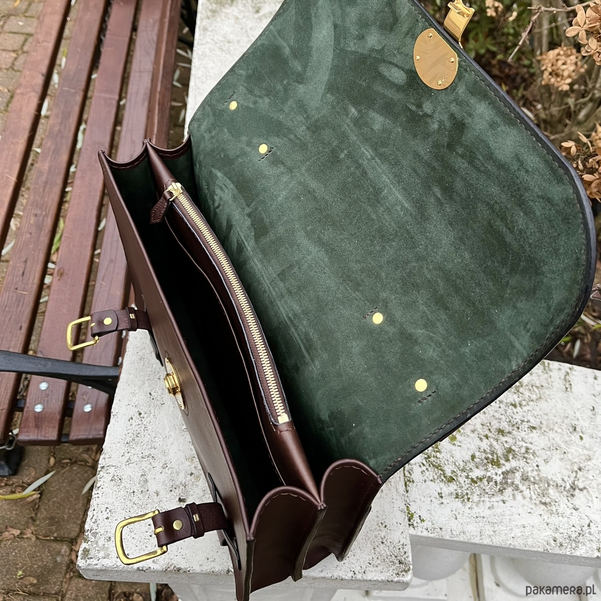 -Zamknięcie i okucia: Mosiężny, centralny zamek typu brytyjskiego z możliwością zamknięcia na klucz. Wszystkie okucia wykonane z mosiądzu, nadają torbie wyjątkowego charakteru.