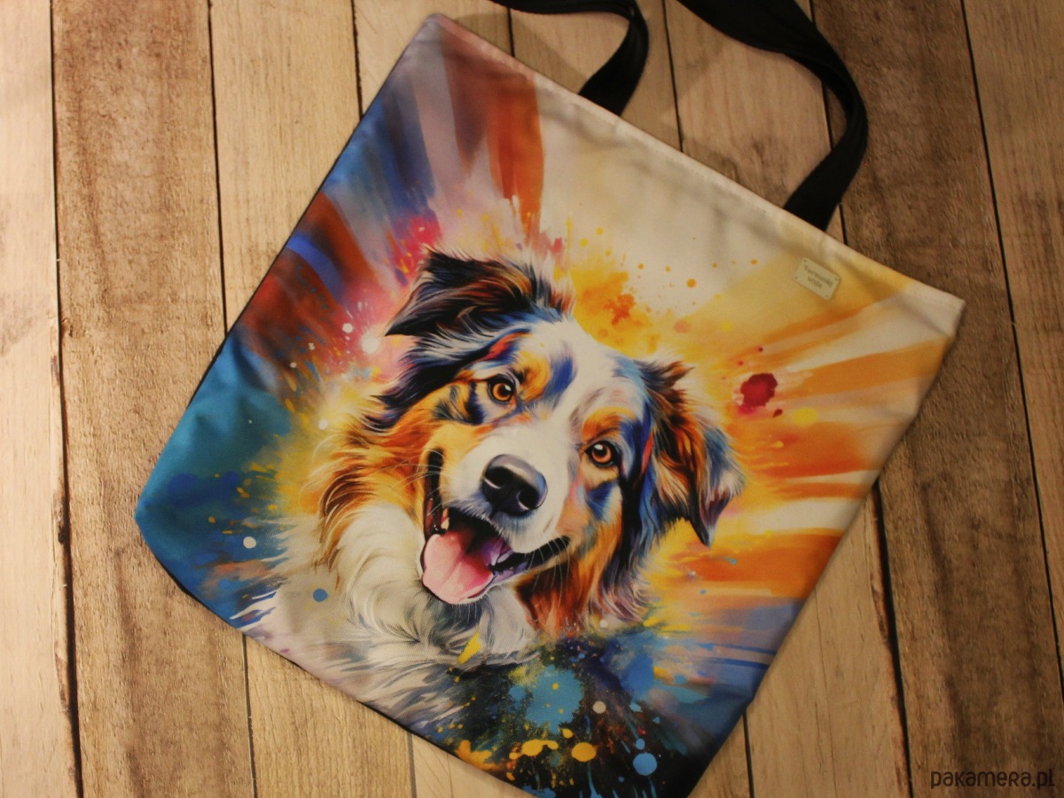 Torba shopperka uszyta z poliestru wodoodpornego z kieszonką w środku.