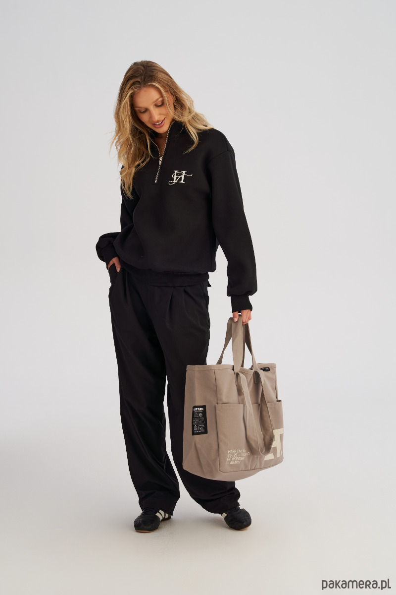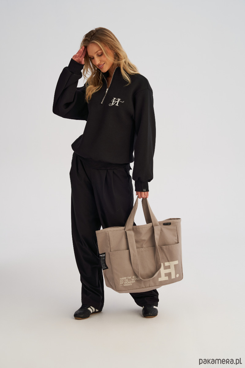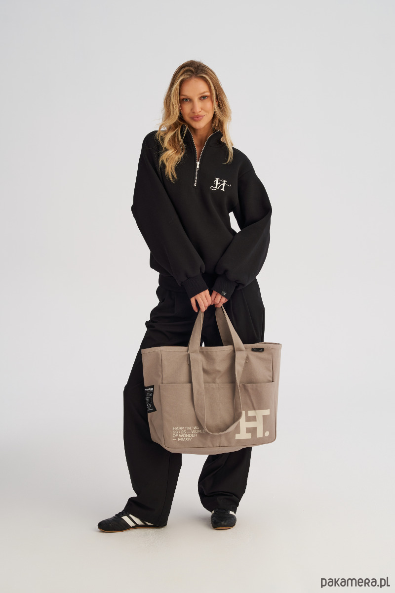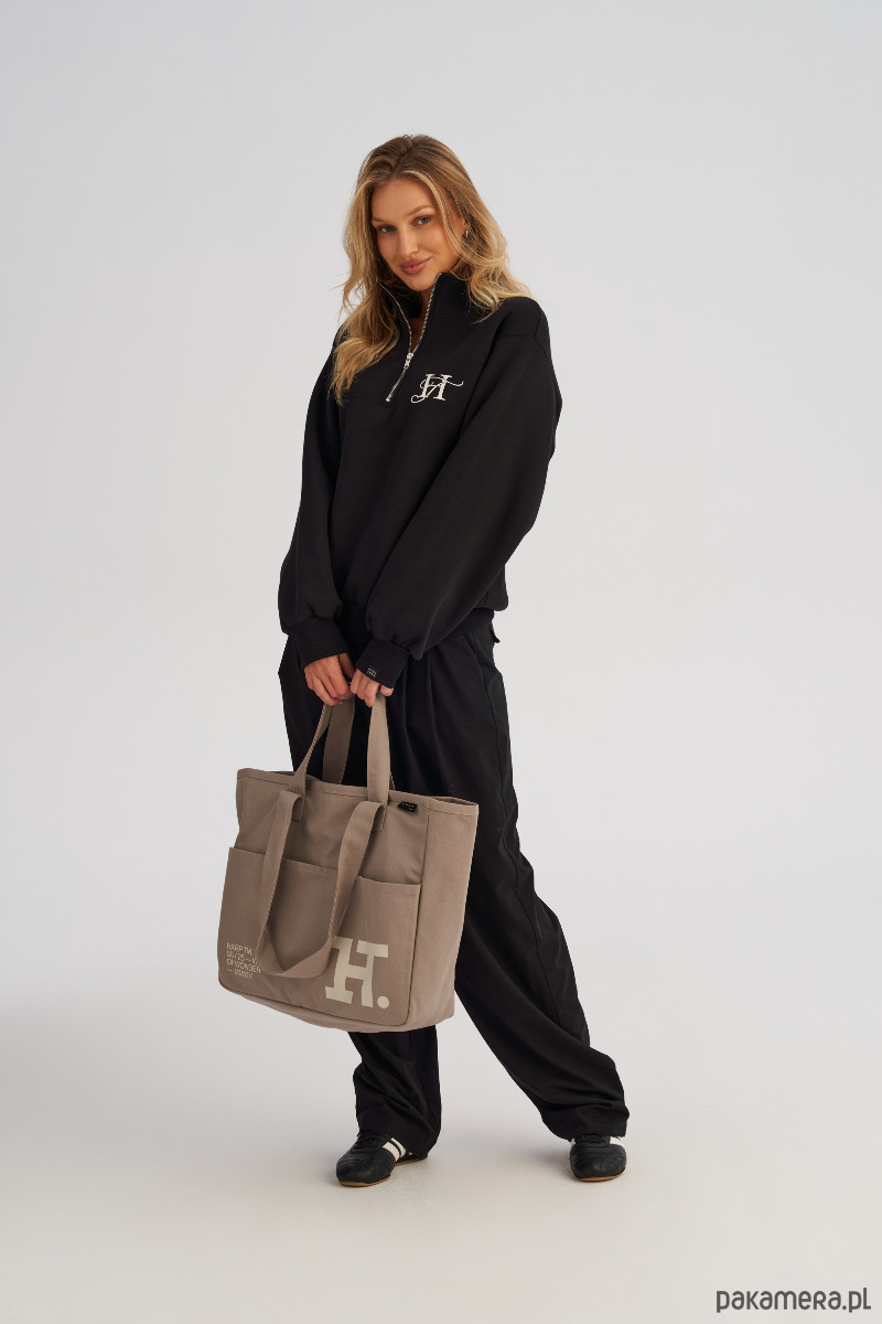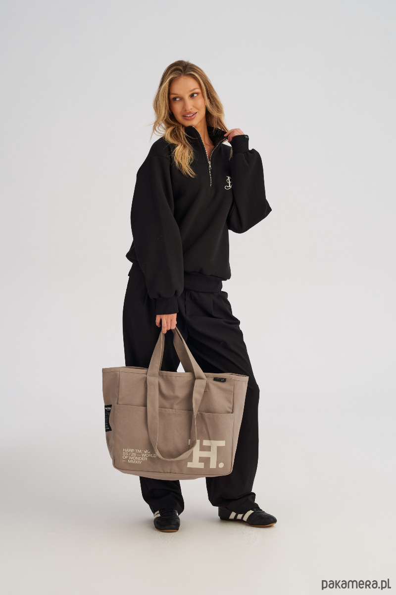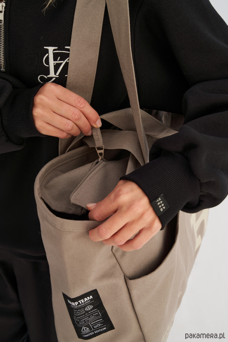 Dwa komplety uchwytów umożliwiają wygodne noszenie torby zarówno w dłoni, jak i na ramieniu, co czyni ją niezwykle wszechstronnym dodatkiem na co dzień. Front torby zdobi nadruk, a ozdobne metki nadają jej modowego charakteru.