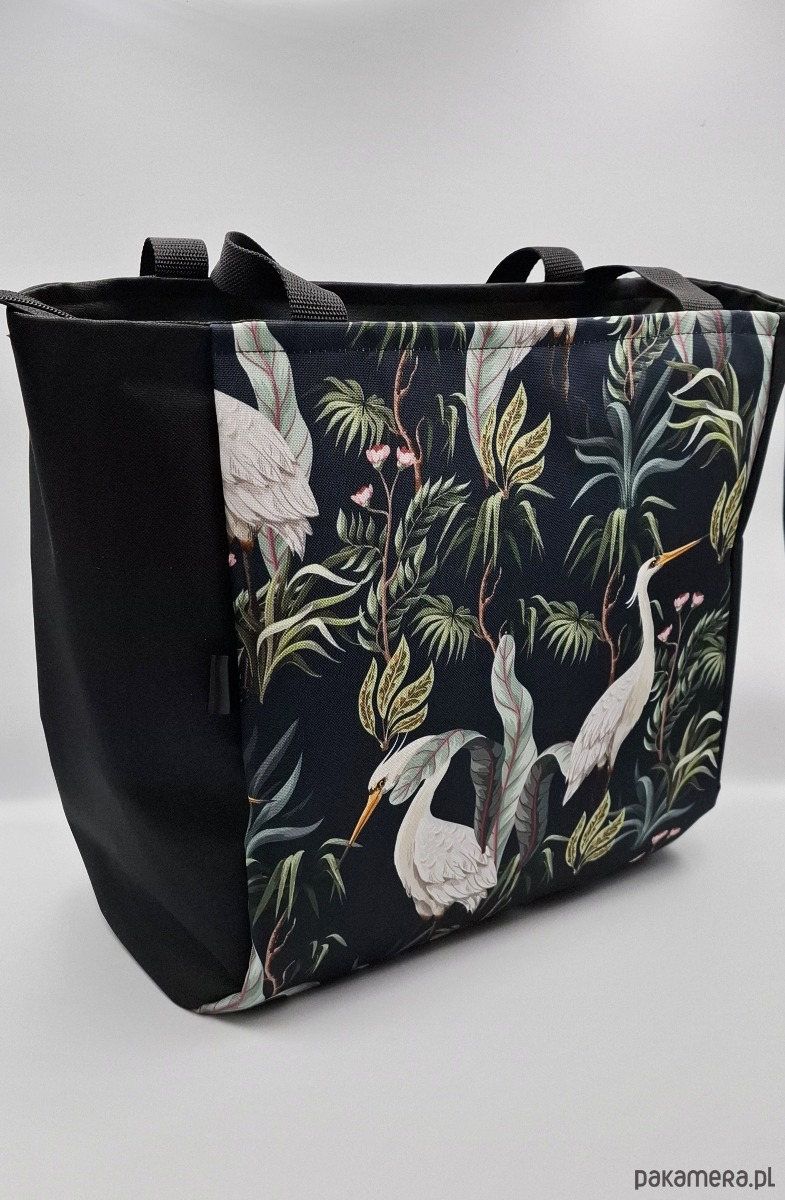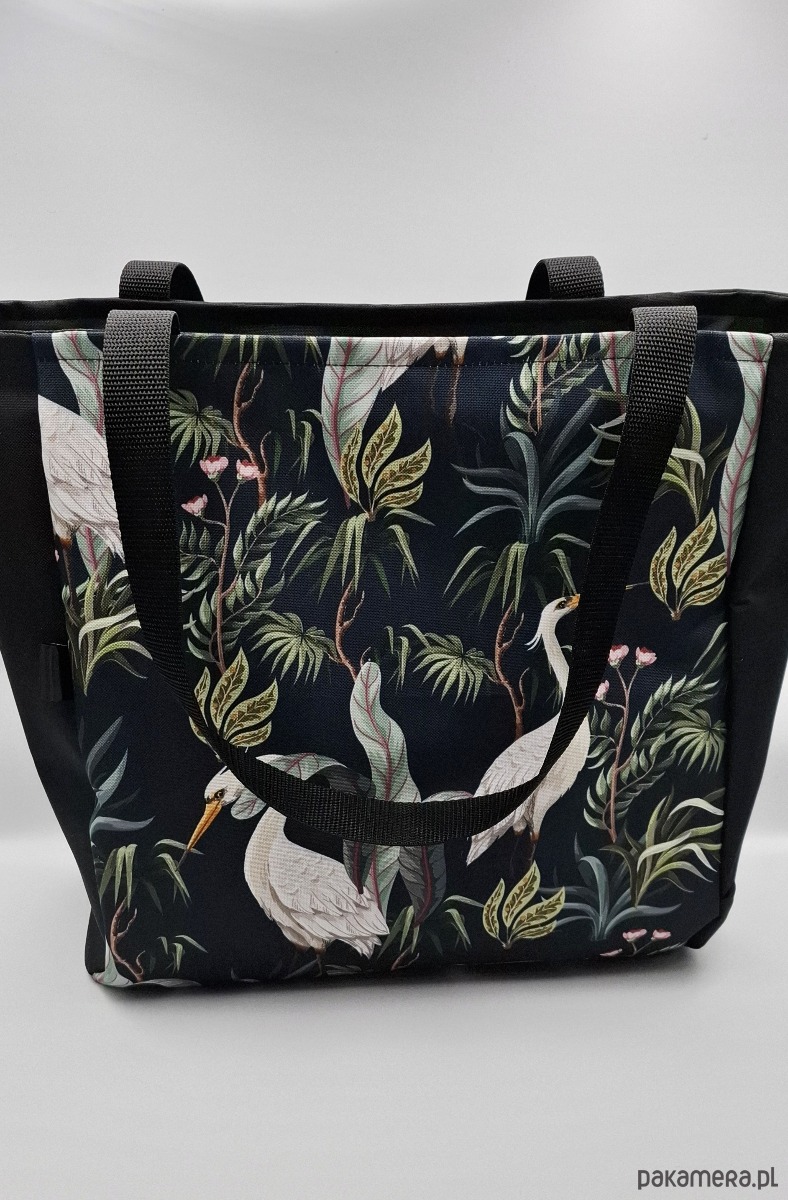 Całość uszyta z tkaniny wodoodpornej. Przód torby to druk w czaple. Tył w kolorze czarnym.