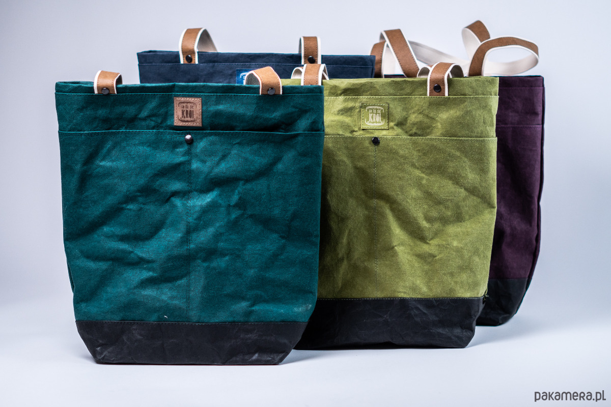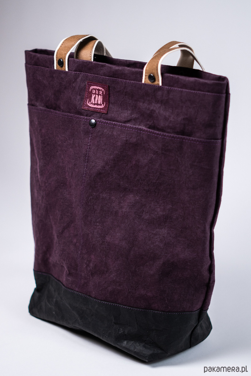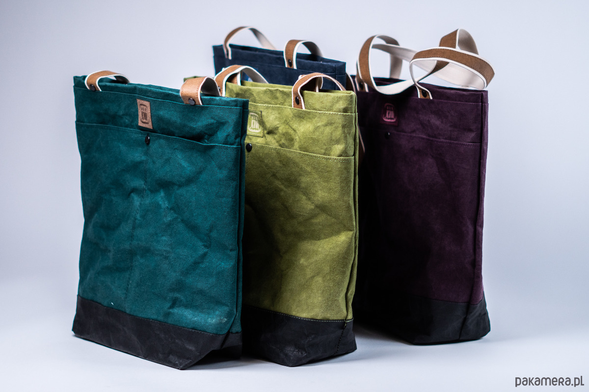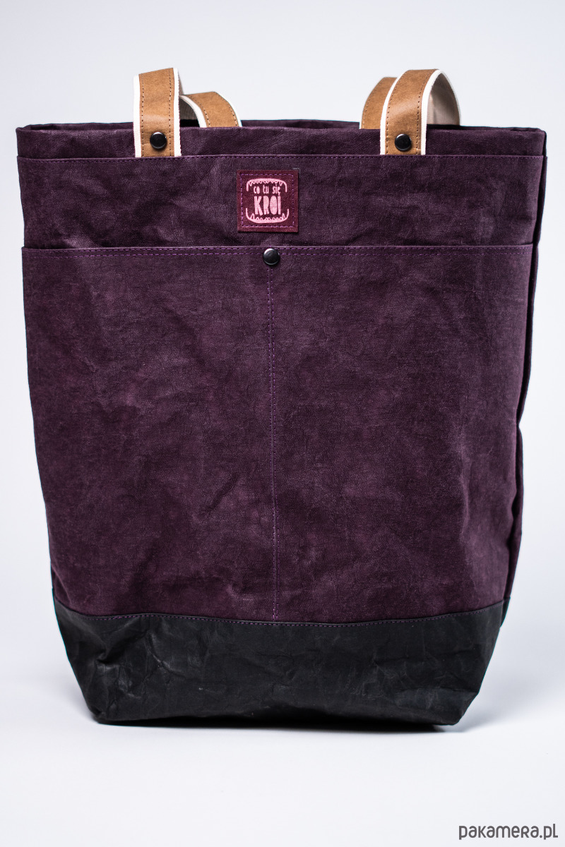 Torba na ramię w formacie +A4 wykonana z kolorowej WASHPAPY w połączeniu z czarną WASHAPĄ na dole torby i klasycznymi brązowymi rączkami.