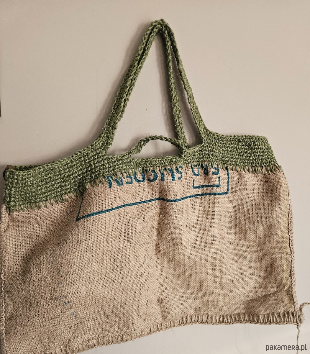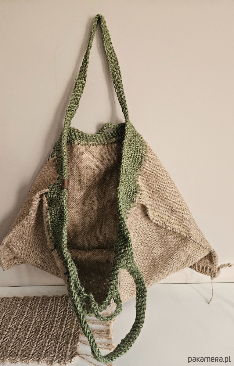 Materiał: worek jutowy po kawie + szydełkowe wykończenie ze sznurka