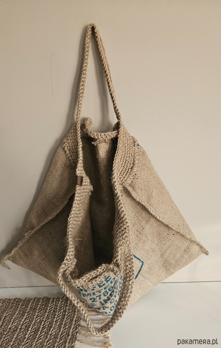 Materiał: worek jutowy po kawie + szydełkowe wykończenie ze sznurka