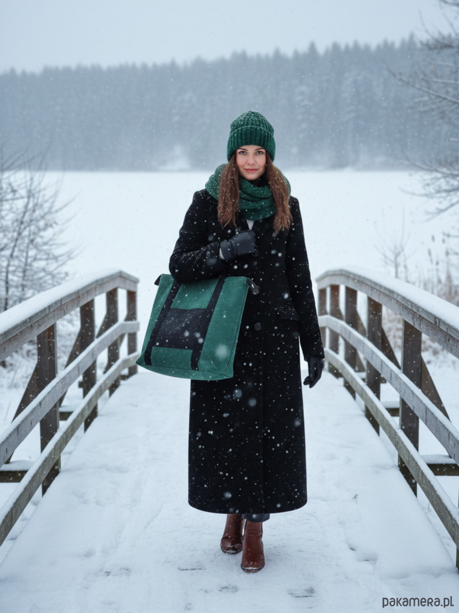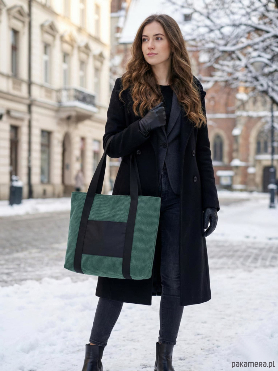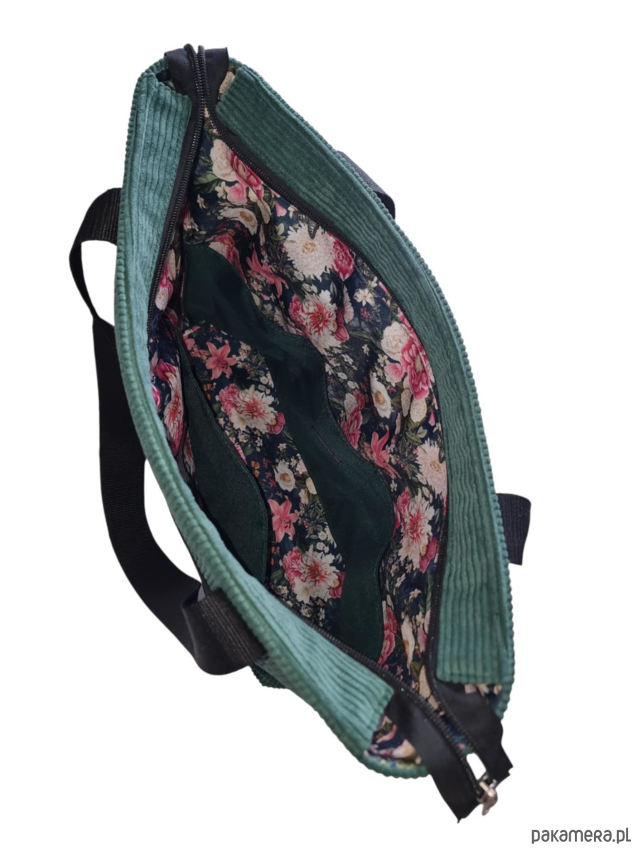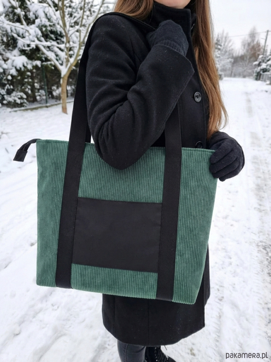 Torba została uszyta z trwałej tkaniny tapicerskiej (sztruks) w kolorze butelkowej zieleni. Czarne pasy parciane biegnące przez całą torbę wzmacniają konstrukcję i nadają jej charakteru. To połączenie nie jest przypadkowe -jest ponadczasowe i praktyczne.