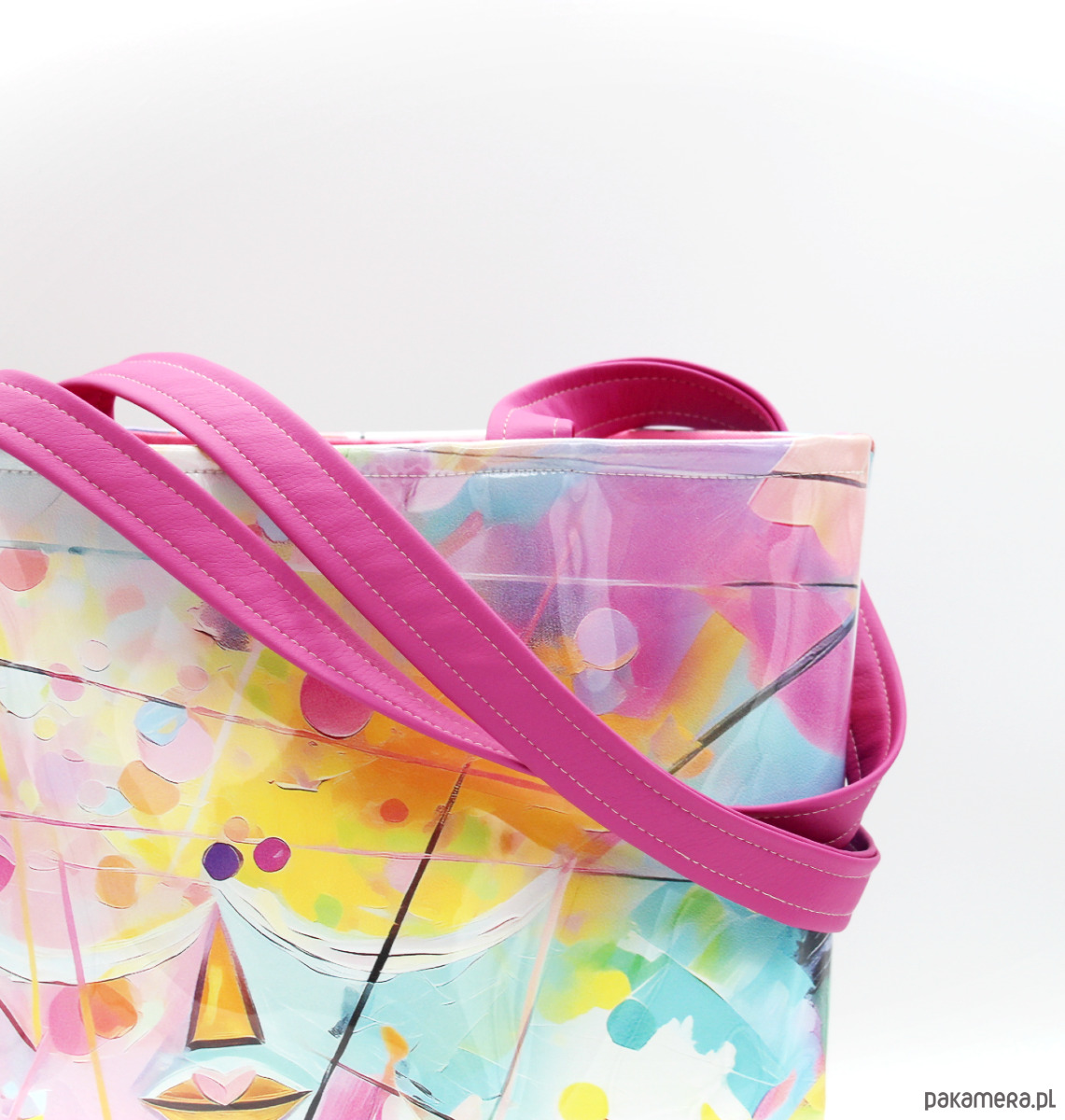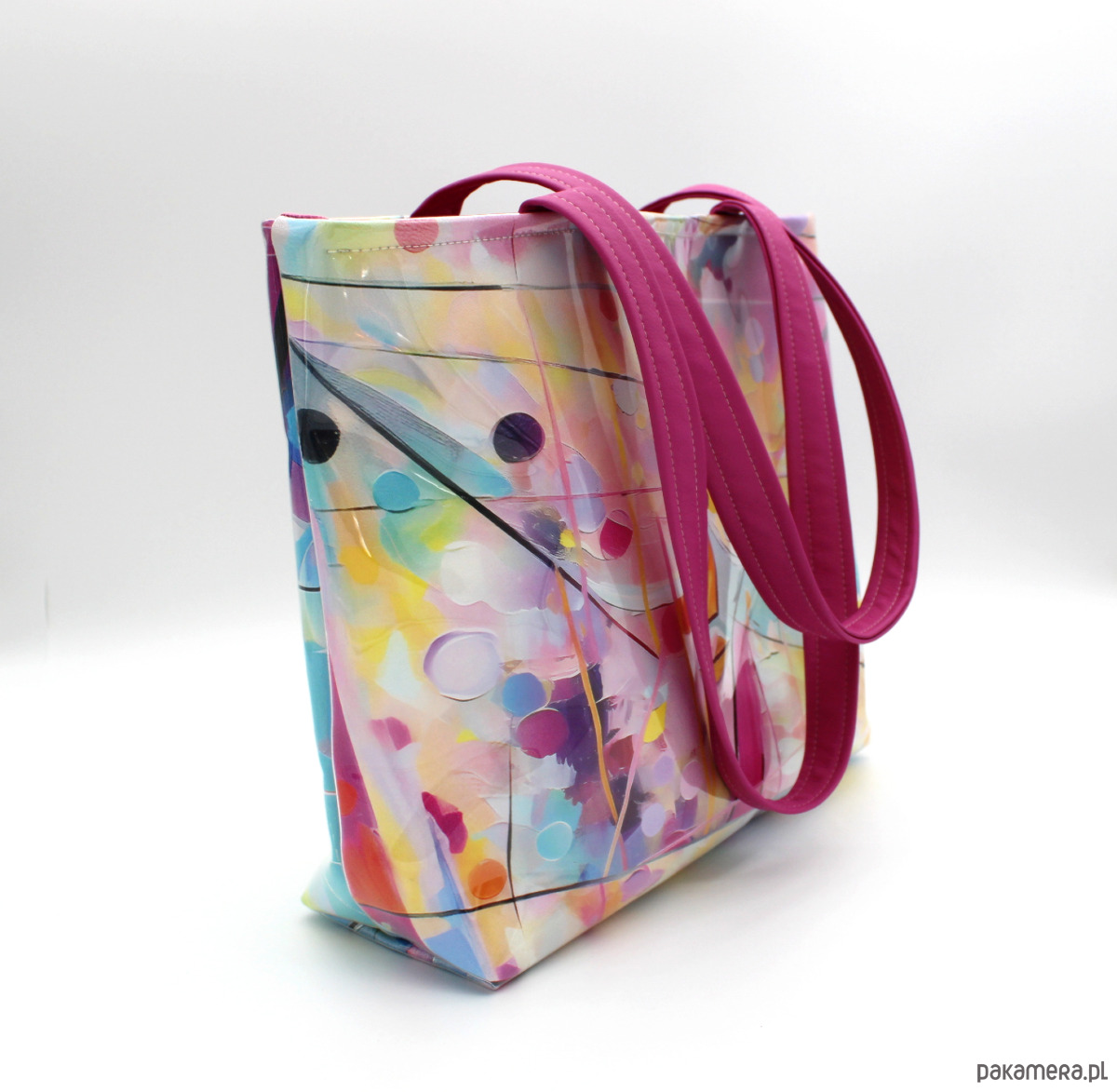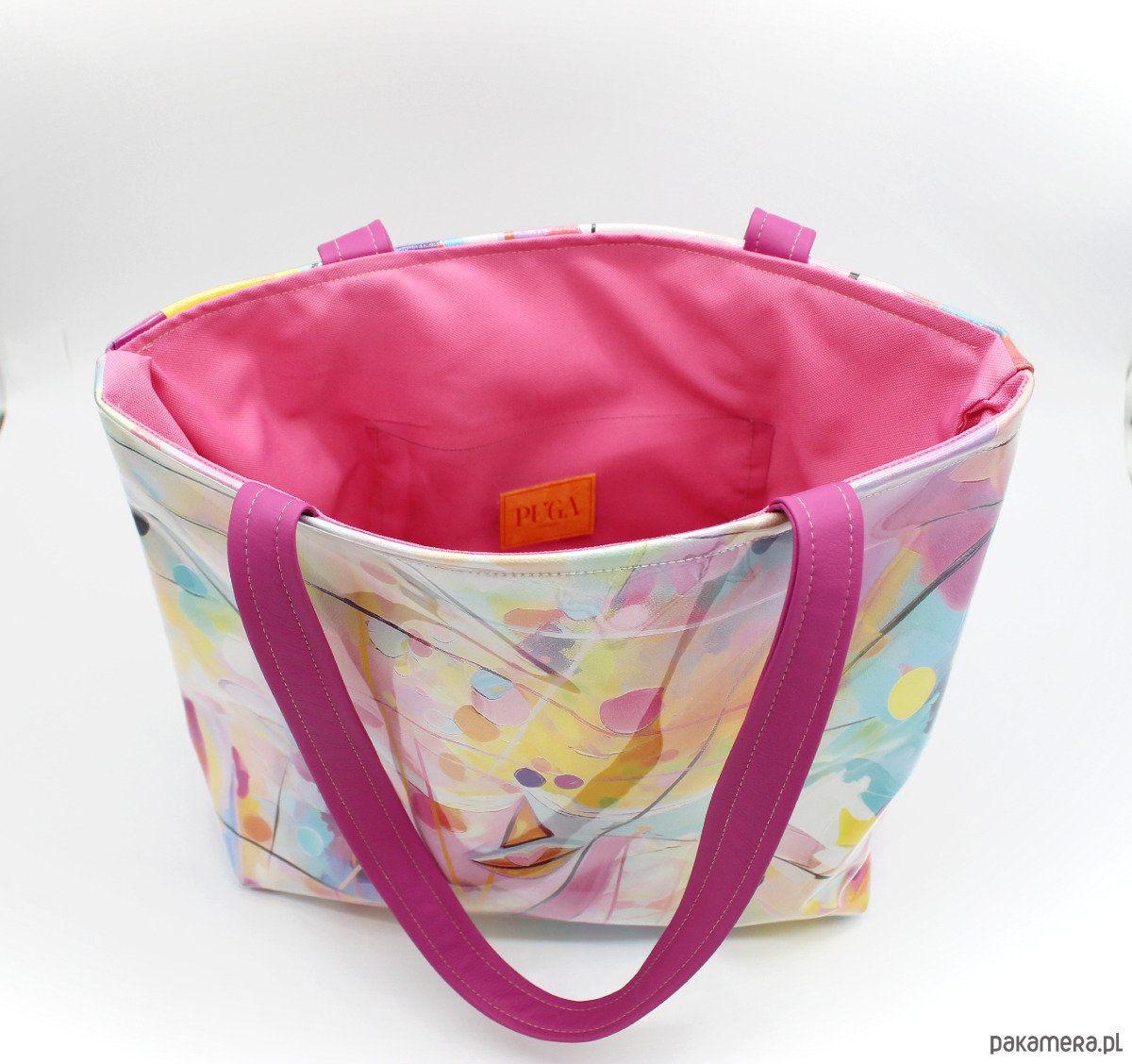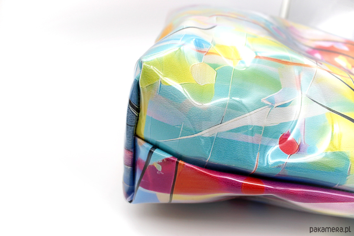 Torba doskonale komponuje się z odważnymi, kreatywnymi stylizacjami, ale równie pięknie podkreśli stonowane, jednokolorowe outfity, dodając im żywego, kolorowego akcentu. Wykonana z ekoskóry, zabezpieczona transparentną folią PCV, zapewnia nie tylko trwałość, ale i funkcjonalność na co dzień. Wnętrze torby zawiera praktyczną, małą kieszonkę, idealną na telefon czy portfel.
