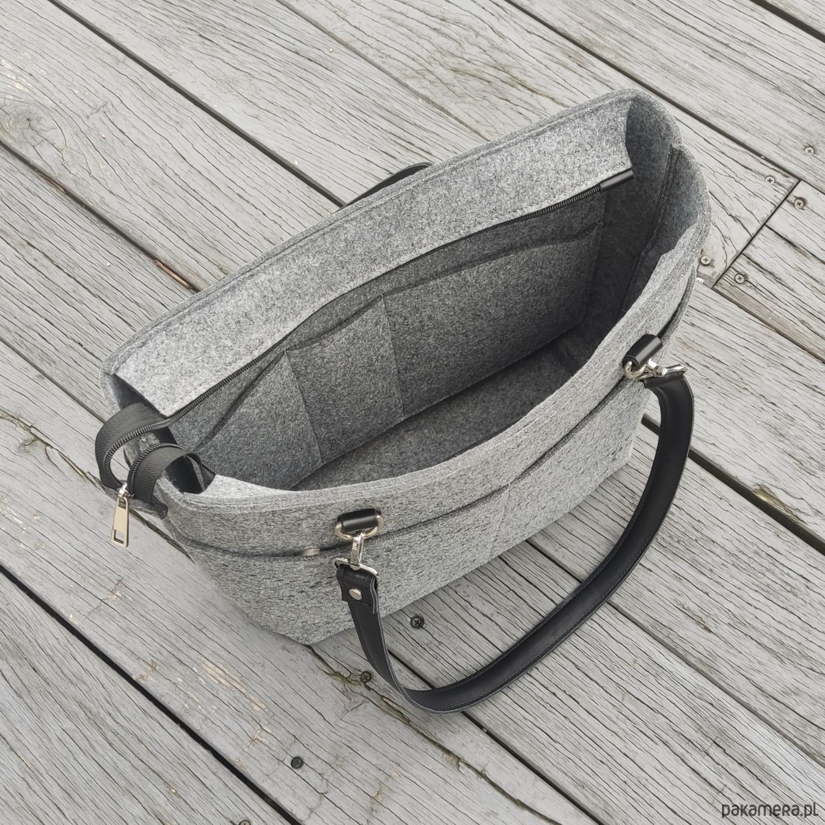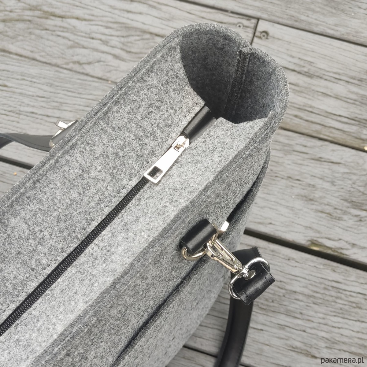 Torebka ta na zewnątrz posiada dwie kieszenie zamykane na magnes. Mogą służyć do przechowania małego notesu, chusteczek, tego czego potrzebujesz szybko mieć pod ręką. Torebka filcowa jest zamykana na zamek błyskawiczny, dzięki czemu możesz bezpiecznie przechowywać w niej ważne przedmioty. Wewnątrz znajdują się także dodatkowe kieszonki na drobne przedmioty, np. klucze, długopisy, telefon, błyszczyk itp. Torebka jest lekka i wygodna w noszeniu, idealna na codzienne wyjścia czy zakupy. Jej minimalistyczny design sprawia, że pasuje do wielu stylizacji i będzie doskonałym dodatkiem do Twojej garderoby.