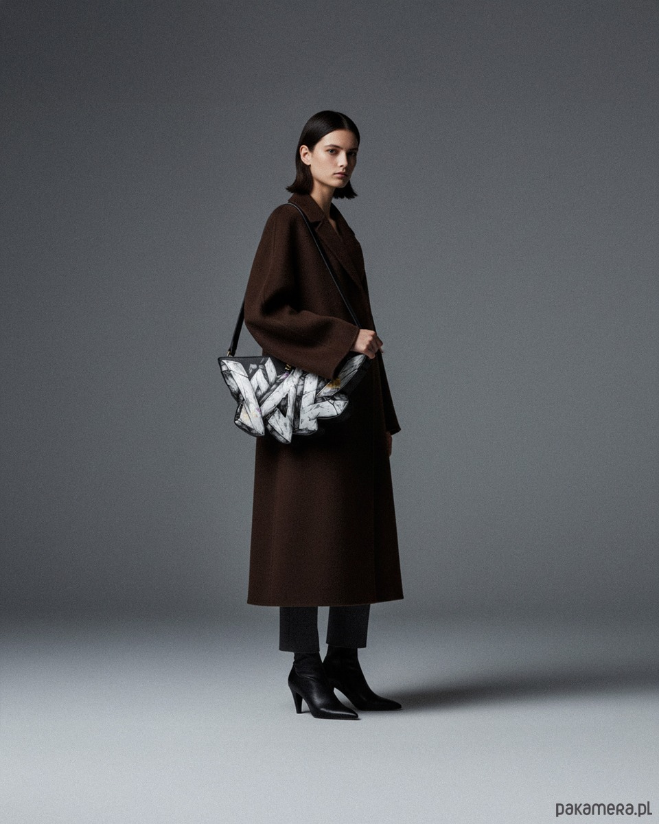 Z przodu znajduje się złoty sygnet The Shoemaker, który nadaje projektowi wyrazistego charakteru. Model zapinany jest na dyskretny magnes ukryty pod podszewką, co łączy funkcjonalność z estetyką. Model jest dostępny w czterech rozmiarach o szerokościach: 28 cm, 44 cm, 50 cm i 60 cm.