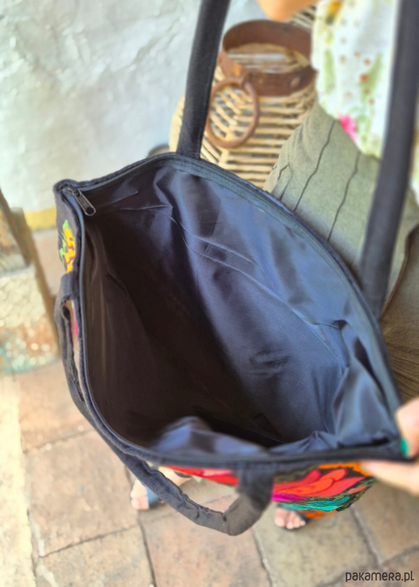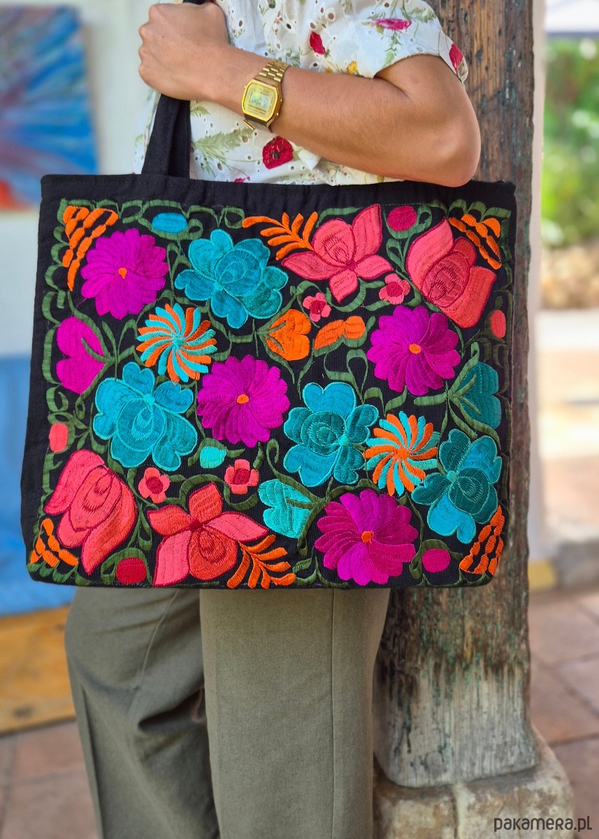 Duża torba z haftem wykonanym w Meksyku to wyjątkowy i piękny dodatek, który łączy w sobie tradycję meksykańskiego rzemiosła i funkcjonalność współczesnego przedmiotu. Haft, który stanowi dekorację torby pochodzi z miejscowości Zinacantan ze stanu Chiapas i jest charakterystyczny dla tego regionu. Każda torba jest unikatowa i posiada bogaty wzór. Haftowane detale są wykonane z kolorowych nici, które tworzą wzory o intensywnych barwach i bogatej teksturze. Torba ta jest nie tylko praktycznym produktem, ale także artystycznym wyrazem meksykańskiej kultury i dziedzictwa. Jest to doskonały sposób na dodanie wyjątkowego stylu i charakteru do codziennych czynności.