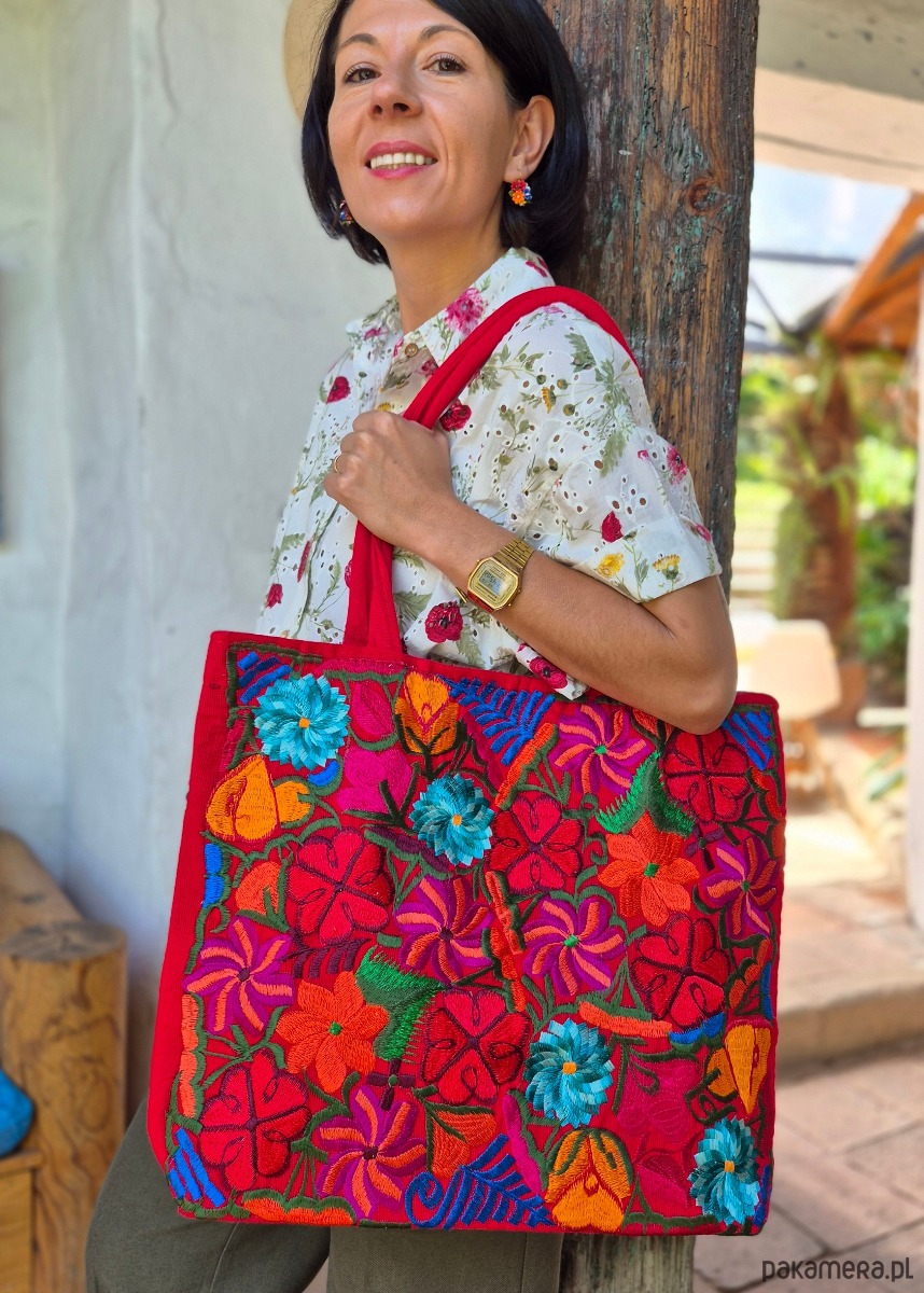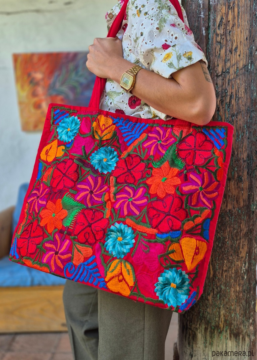 Duża torba z haftem wykonanym w Meksyku to wyjątkowy i piękny dodatek, który łączy w sobie tradycję meksykańskiego rzemiosła i funkcjonalność współczesnego przedmiotu. Haft, który stanowi dekorację torby pochodzi z miejscowości Zinacantan ze stanu Chiapas i jest charakterystyczny dla tego regionu. Każda torba jest unikatowa i posiada bogaty wzór. Haftowane detale są wykonane z kolorowych nici, które tworzą wzory o intensywnych barwach i bogatej teksturze. Torba ta jest nie tylko praktycznym produktem, ale także artystycznym wyrazem meksykańskiej kultury i dziedzictwa. Jest to doskonały sposób na dodanie wyjątkowego stylu i charakteru do codziennych czynności.