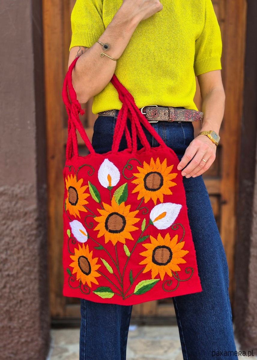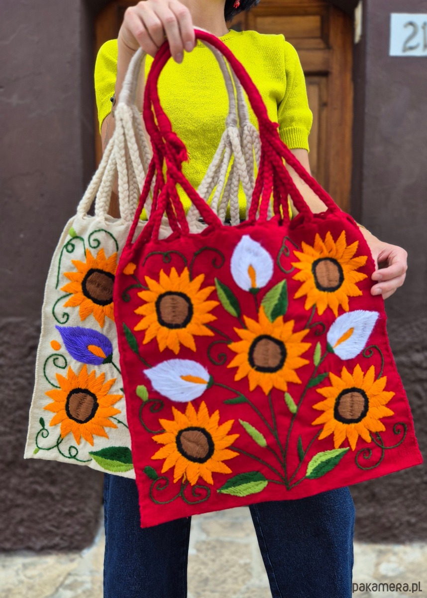 Torba na zakupy z haftem ręcznie wykonanym w Meksyku to wyjątkowy i piękny dodatek, który łączy w sobie tradycję meksykańskiego rzemiosła i funkcjonalność współczesnego przedmiotu. Haftowane motywy są wykonywane z precyzją i starannością przez lokalnych rzemieślników, którzy przekazują swoje umiejętności z pokolenia na pokolenie. Każda torba jest unikatowa i posiada bogaty wzór. Haftowane detale są wykonane z kolorowych nici, które tworzą wzory o intensywnych barwach i bogatej teksturze. Torba ta jest nie tylko praktycznym narzędziem do przenoszenia zakupów, ale także artystycznym wyrazem meksykańskiej kultury i dziedzictwa. Jest to doskonały sposób na dodanie wyjątkowego stylu i charakteru do codziennych czynności.