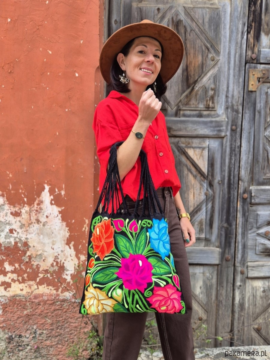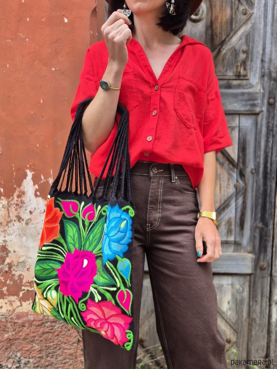 Torba na zakupy z haftem wykonanym w Meksyku w miejscowości Zinacantan, która słynie ze swoich bogatych haftowanych wzorów. Kwiaty na torbie są wykonywane z precyzją i starannością przez lokalnych rzemieślników, którzy przekazują swoje umiejętności z pokolenia na pokolenie. Każda torba jest unikatowa i posiada bogaty wzór. Torba ta jest nie tylko praktycznym narzędziem do przenoszenia zakupów, ale także artystycznym wyrazem meksykańskiej kultury i dziedzictwa. Jest to doskonały sposób na dodanie wyjątkowego stylu i charakteru do codziennych czynności.
