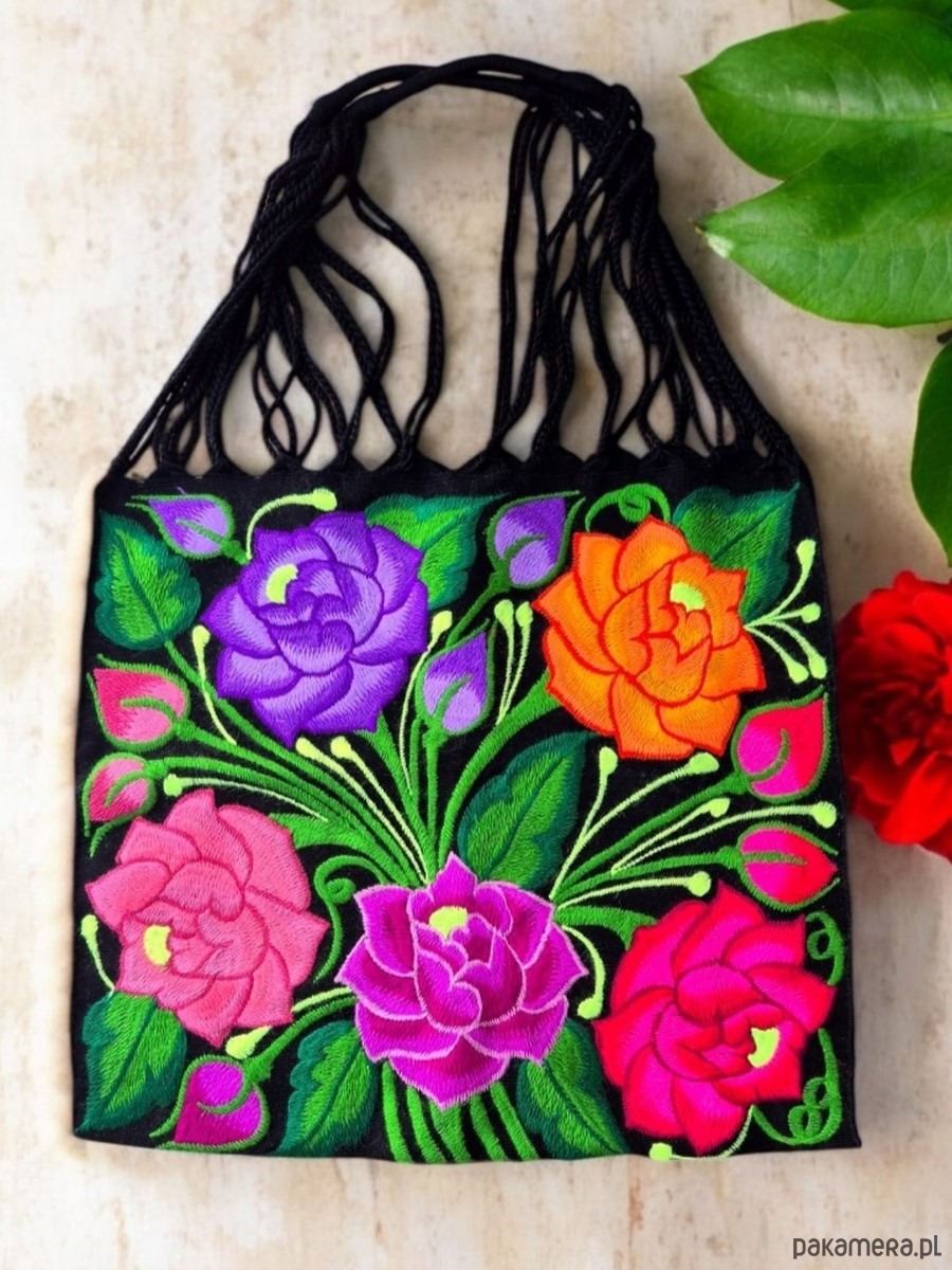 Torba na zakupy z haftem wykonanym w Meksyku w miejscowości Zinacantan, która słynie ze swoich bogatych haftowanych wzorów. Kwiaty na torbie są wykonywane z precyzją i starannością przez lokalnych rzemieślników, którzy przekazują swoje umiejętności z pokolenia na pokolenie. Każda torba jest unikatowa i posiada bogaty wzór. Torba ta jest nie tylko praktycznym narzędziem do przenoszenia zakupów, ale także artystycznym wyrazem meksykańskiej kultury i dziedzictwa. Jest to doskonały sposób na dodanie wyjątkowego stylu i charakteru do codziennych czynności.